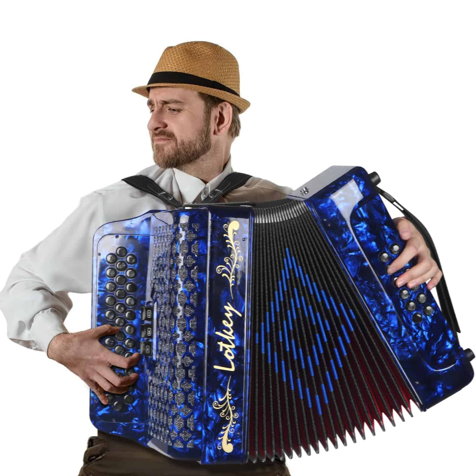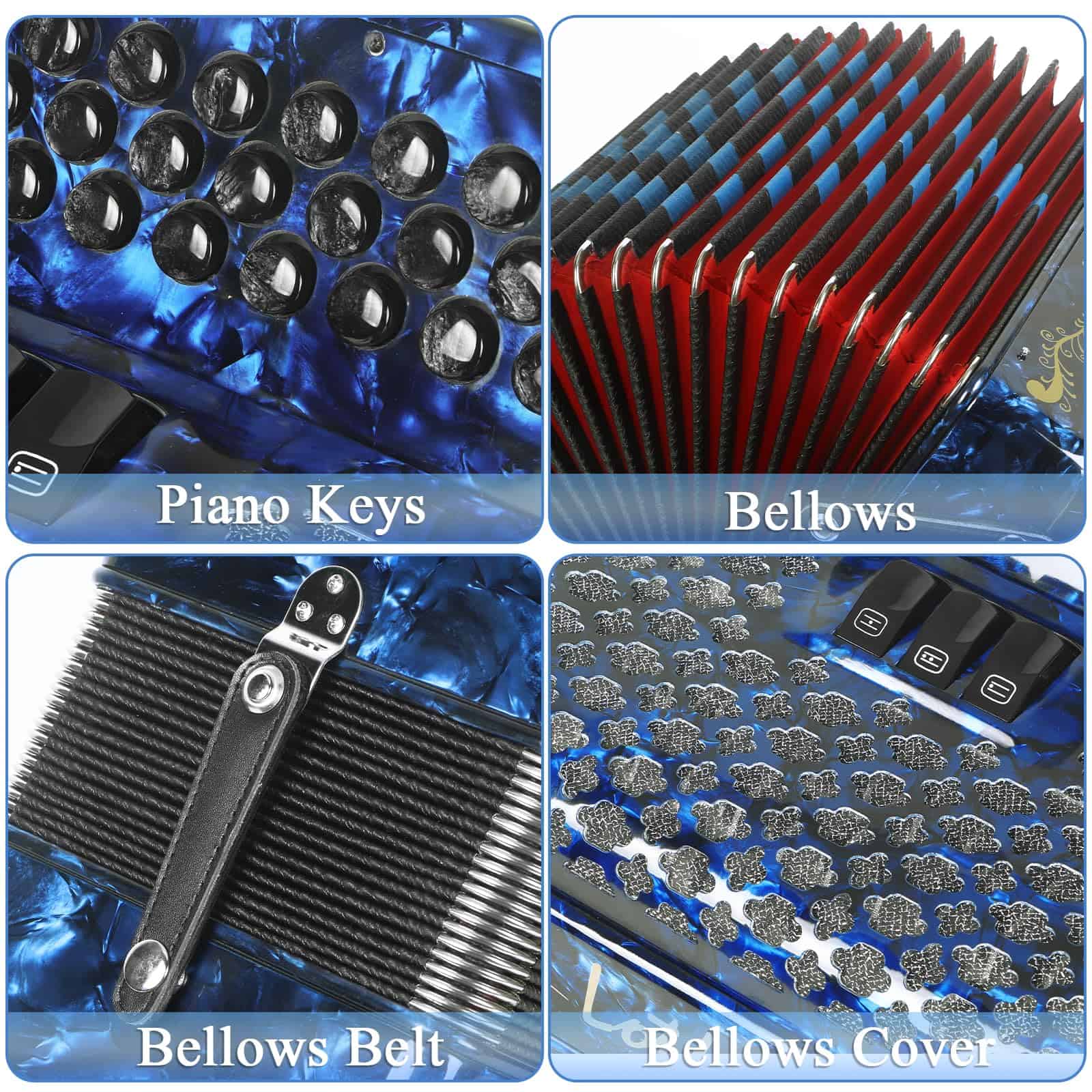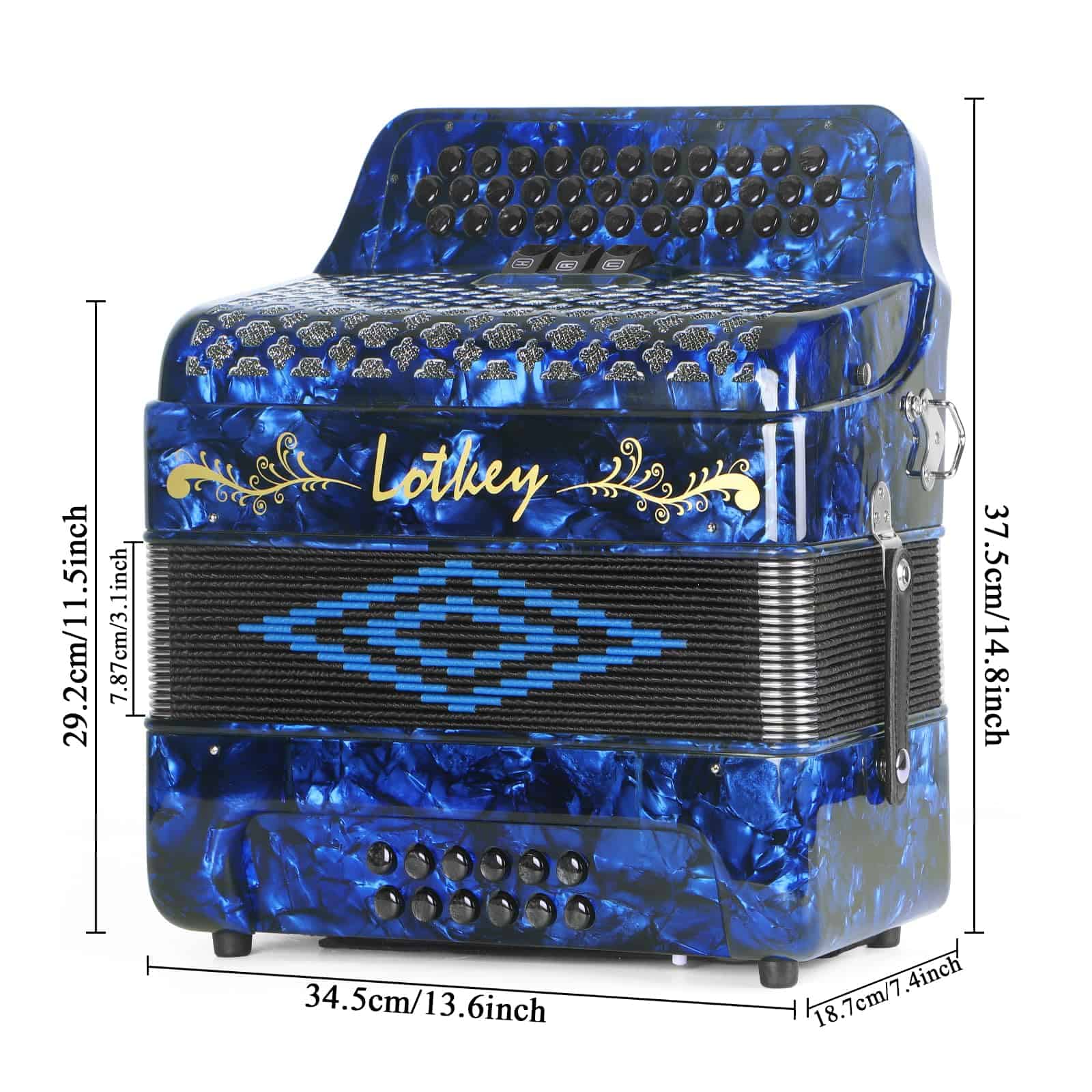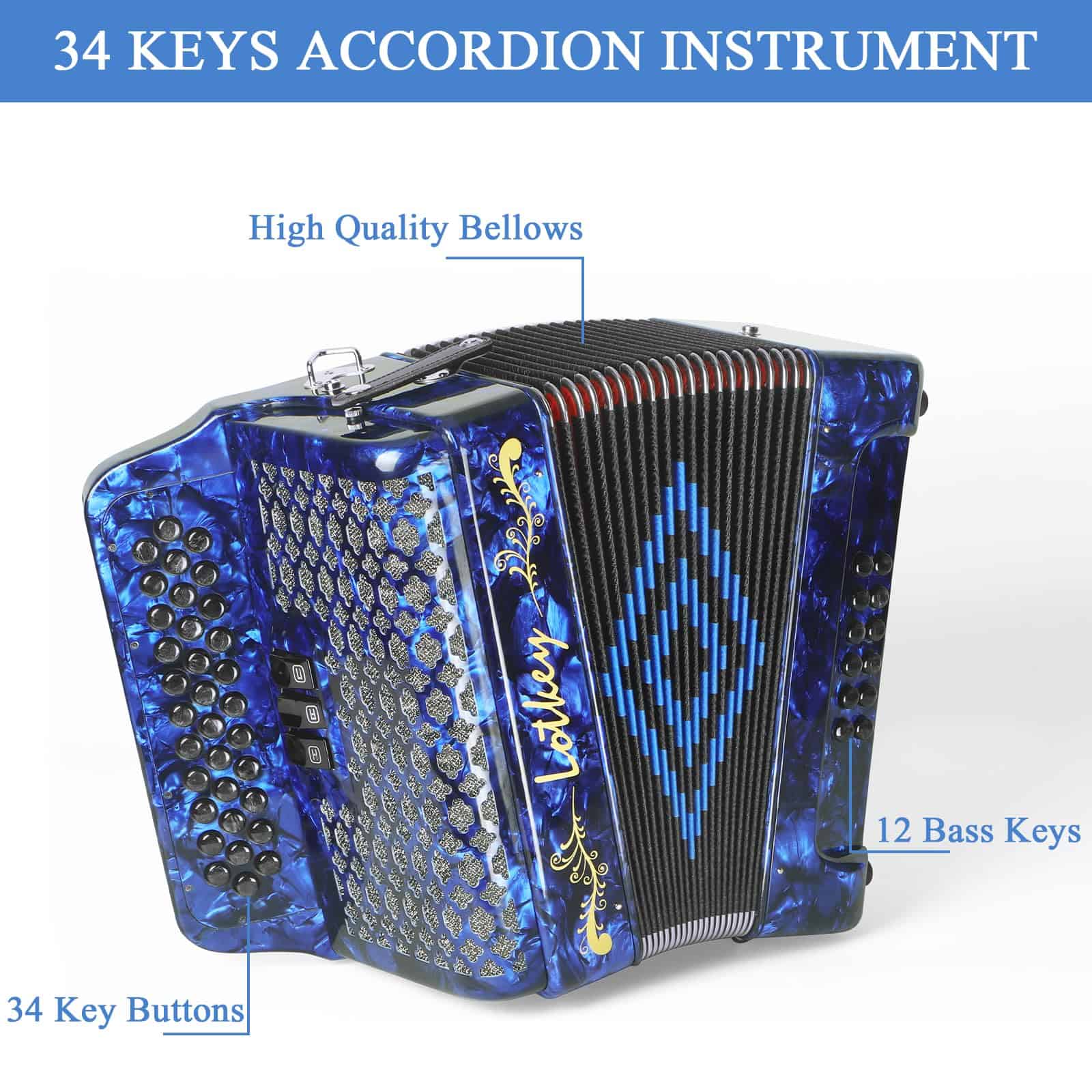 Este acordeón de botones diatónico Lotkey cuenta con 34 teclas y 12 botones de bajo, siendo un instrumento actualizado que satisface las necesidades de los profesionales. Utiliza una tecnología especial de reducción de ruido en el proceso de producción para proporcionar un tono de acordeón rico y potente. El diseño del acordeón está hecho de material de alta calidad – celuloide, que mejora la hermeticidad y ductilidad de los fuelles, ofreciendo un tono más puro y un acordeón más duradero. Las teclas tienen un diseño único y encantador translúcido.