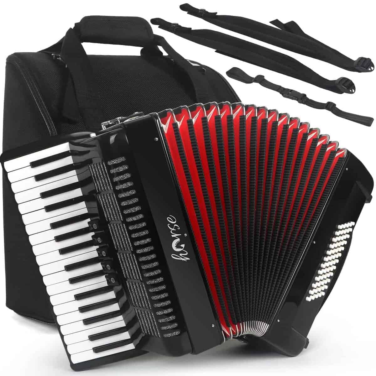 6. Incluye paquete: Este acordeón viene en una caja maletín, que está bien acolchada, por lo que no tienes que preocuparte por dañar el instrumento. También incluye una correa ajustable para los bajos.