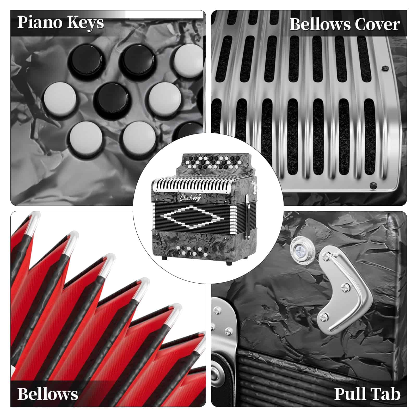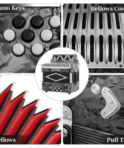Este acordeón diatónico de 31 teclas, 12 bajos, en tonalidades G/C/F es el instrumento perfecto para adultos. Viene con una maleta acolchada para protegerlo, además de un par de correas, un paño de limpieza y un par de guantes. Con tecnología especial de amortiguación de ruido para un tono de acordeón rico y robusto. Ideal para principiantes y músicos profesionales. Compacto, portátil y fácil de tocar. Adecuado para música cajún y varios estilos europeos. ¡Un regalo perfecto para amigos o familiares!