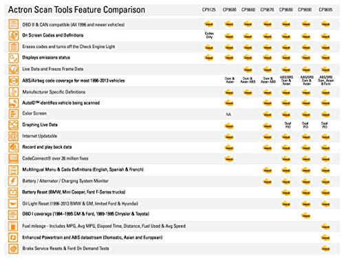 El CP9660 POCKETSCAN PLUS es pequeño en tamaño, perfecto para un fácil almacenamiento y uso, pero es una herramienta de escaneo potente. Lee y borra códigos de avería del motor (DTC) en TODOS los vehículos importados y nacionales vendidos en los EE. UU. a partir de 1996 (OBD II y CAN) y también los vehículos compatibles con OBD II de 94 y 95. Los códigos de avería del motor (DTC) y sus descripciones son solo el comienzo de las tareas que puede realizar PocketScan Plus también proporciona datos de imagen congelada, DTC permanentes, información del VIN y realiza la importante tarea de prueba de preparación para inspección y mantenimiento (I/M) mostrando el estado del monitor de preparación para la I/M. Las nuevas características que se han agregado a la herramienta incluyen datos en tiempo real del vehículo, interruptores de sensores y entradas de relés, comandos globales de Lectura / Borrado de Códigos de OBD II con definiciones específicas del fabricante y códigos y definiciones de ABS para la MAYORÍA de los vehículos GM, Ford, Chrysler, Toyota, Honda, Nissan y Hyundai de 1996 a 2013. Con su amplia pantalla y diseño ergonómico, es fácil de leer y manejar en el taller o cualquier garaje. Esta es una excelente herramienta para tener en el mostrador para que los escritores de servicio realicen diagnósticos rápidos en los vehículos que ingresan. Cada herramienta de escaneo y lector de códigos de Actron incorpora la Tecnología CAN y patentada ‘TrueLink’, lo que significa que la herramienta se vinculará y comunicará con todos los vehículos compatibles con OBD II (1996 y posteriores), asegurando al usuario una salida de diagnóstico rápida y precisa: el ingrediente clave para una reparación efectiva.