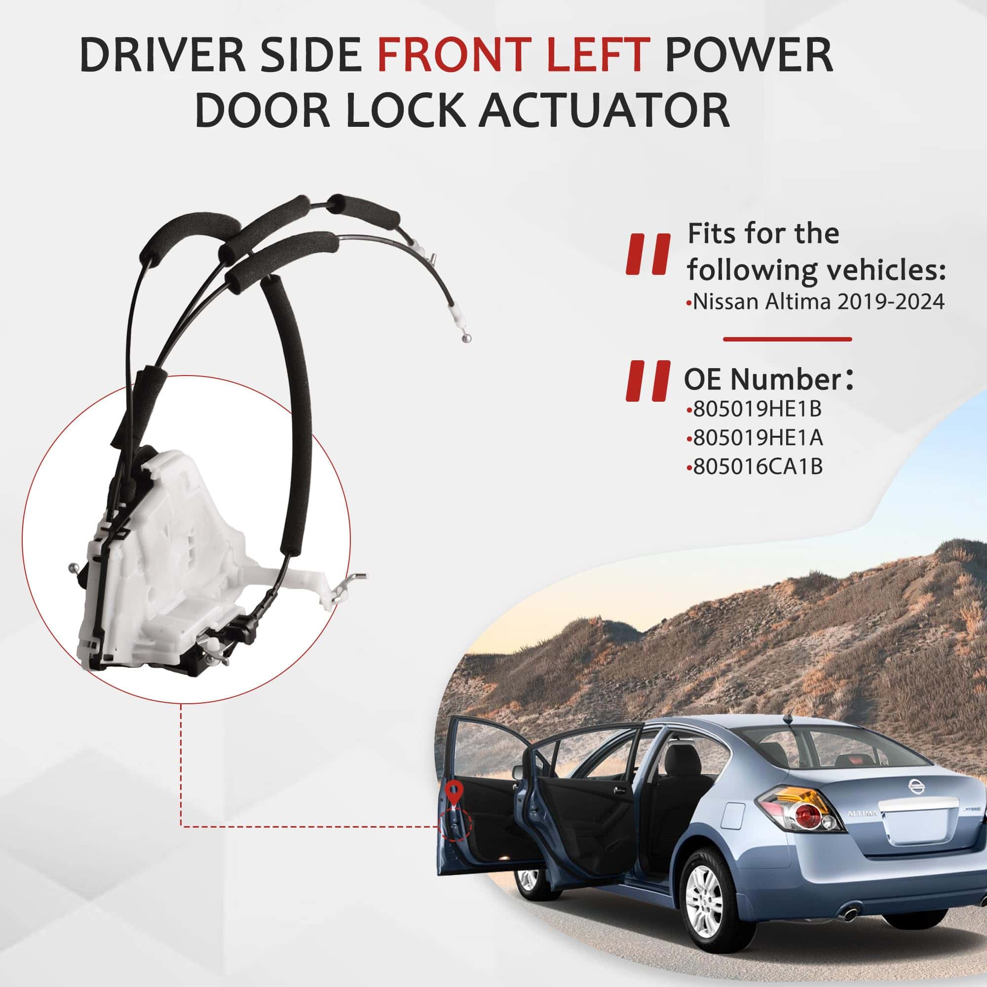Actuador de cierre de puerta delantera izquierda del conductor compatible con Nissan Altima 2019-2024. Reemplazo directo para OEM 80501-9HE1A, 805019HE1B, 805019HE1A, 805016CA1B. Hecho de materiales de alta calidad y duraderos para una larga vida útil. Fácil instalación sin necesidad de herramientas especiales. Colocación en el vehículo: lado del conductor delantero. Garantía de calidad de 1 año para una tranquilidad adicional. Asegúrese de comprar con confianza sabiendo que estamos comprometidos con su satisfacción.
