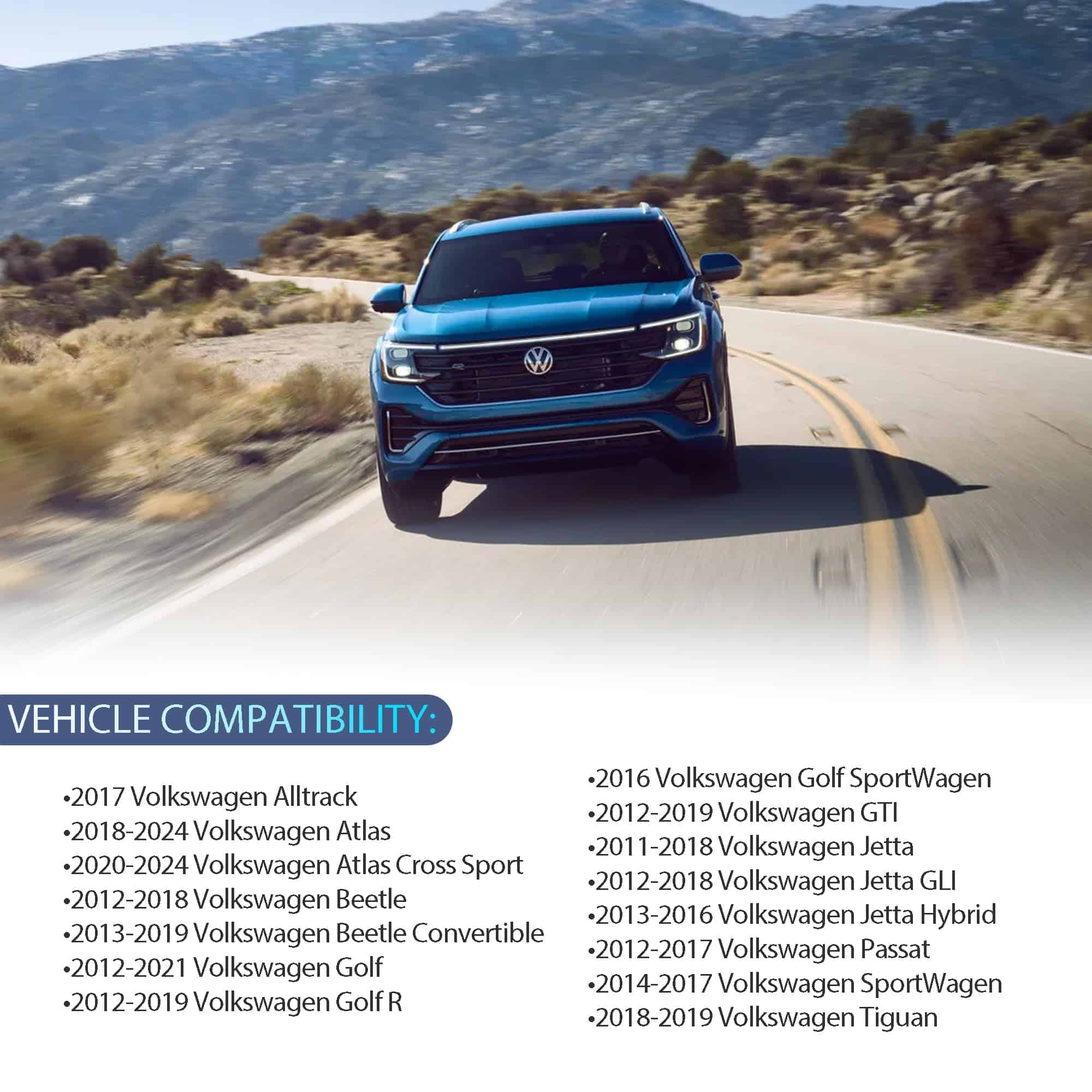 1. COMPATIBLE PARA: Para VW Alltrack 2017, Para VW Atlas 2018-2024, Para VW Atlas Cross Sport 2020-2024, Para VW Beetle 2012-2018, Para VW Beetle Convertible 2013-2019, Para VW e-Golf 2015-2019, Para VW Golf 2012-2021, Para VW Golf R 2012-2019, Para VW Golf SportWagen 2016, Para VW GTI 2012-2019, Para VW Jetta 2011-2018, Para VW Jetta GLI 2012-2018, Para VW Jetta Hybrid 2013-2016, Para VW Passat 2012-2017, Para VW SportWagen 2014-2017, Para VW Tiguan 2018-2019.