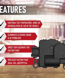 Motor actuador de puerta de aire acondicionado y calefacción de reemplazo – controla el flujo o temperatura del aire en el interior del vehículo. Este componente comúnmente falla en modelos de vehículos populares, y generalmente produce un sonido de clic o golpe durante su funcionamiento cuando está defectuoso y resulta en temperaturas incorrectas de aire acondicionado o calefacción dentro del vehículo. Compatible Reemplazo para vehículos Chrysler, Dodge, Mitsubishi, Ram y Volkswagen – 300 2008-2021 | Town and Country 2008-2016 | Challenger 2008-2021 | Charger 2008-2021 | Dakota 2008-2010 | Grand Caravan 2008-2020 | Magnum 2008 | Raider 2008-2009 | C/V 2012-2015 | Dakota 2011 | Routan 2009-2014. Reemplaza la pieza 604-024, 68031977AA, 68033337AA, 68238243AA, 68299450AA, 7B0907512, 7B0907512A, 7B0907512B, comúnmente encontrada en modelos populares 300, Town and Country, Challenger, Charger, Dakota, Grand Caravan, Magnum, Raider, CV, Dakota y Routan incluyendo los años 2008-2021. Si no puedes cambiar la dirección del aire en tu vehículo, es posible que tengas un problema con tu actuador de puerta de mezcla de aire acondicionado. Ajuste OEM, Calidad, Acabado – Aunque no es una pieza OEM genuina, es un reemplazo directo y se adaptará y funcionará exactamente como la pieza de fábrica. Este actuador de puerta de temperatura de aire de reemplazo fabricado por AA Ignition cuenta con una carcasa rediseñada y una placa de circuito robusta para garantizar que dure más que tu pieza de fábrica. Este actuador de puerta de mezcla de aire de reemplazo viene completo con una [FEATURE]. Si la pieza falla en tu vehículo, simplemente ponte en contacto con nosotros para obtener un reemplazo. Ahorra cientos de dólares en comparación con los precios de concesionarios al comprar este actuador y reemplazar la pieza por ti mismo.
