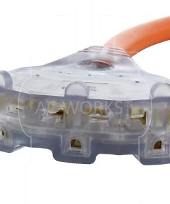 Este cordón de enchufe de marca AC WORKS S1450W620-018 tiene 1.5 pies de largo con un enchufe NEMA 14-50P de 50 Amp 125/250 Voltios a (3) conectores hembra NEMA 6-15/20R de 20 Amp T-blade. Las tomas del cable vienen con indicador de encendido. El cable es de alambre de cobre STW 10/3 de 30 Amp con recubrimiento anti-frío de 600 Voltios. Incluido con tu compra hay una garantía limitada de 5 años. NEMA 14-50P, 50 Amp, 125/250 Voltios, Enchufe de 4 Puntas para RV/Range. Tres Conectores NEMA 6-15/20, 20 Amp, 250 Volt, T-blade. Cordón de Distribución de Alta Potencia – Permitiendo alimentar múltiples equipos a la vez. Adaptador NEMA 14-50P a (3) 6-15/20R. Garantía Limitada de 5 Años.