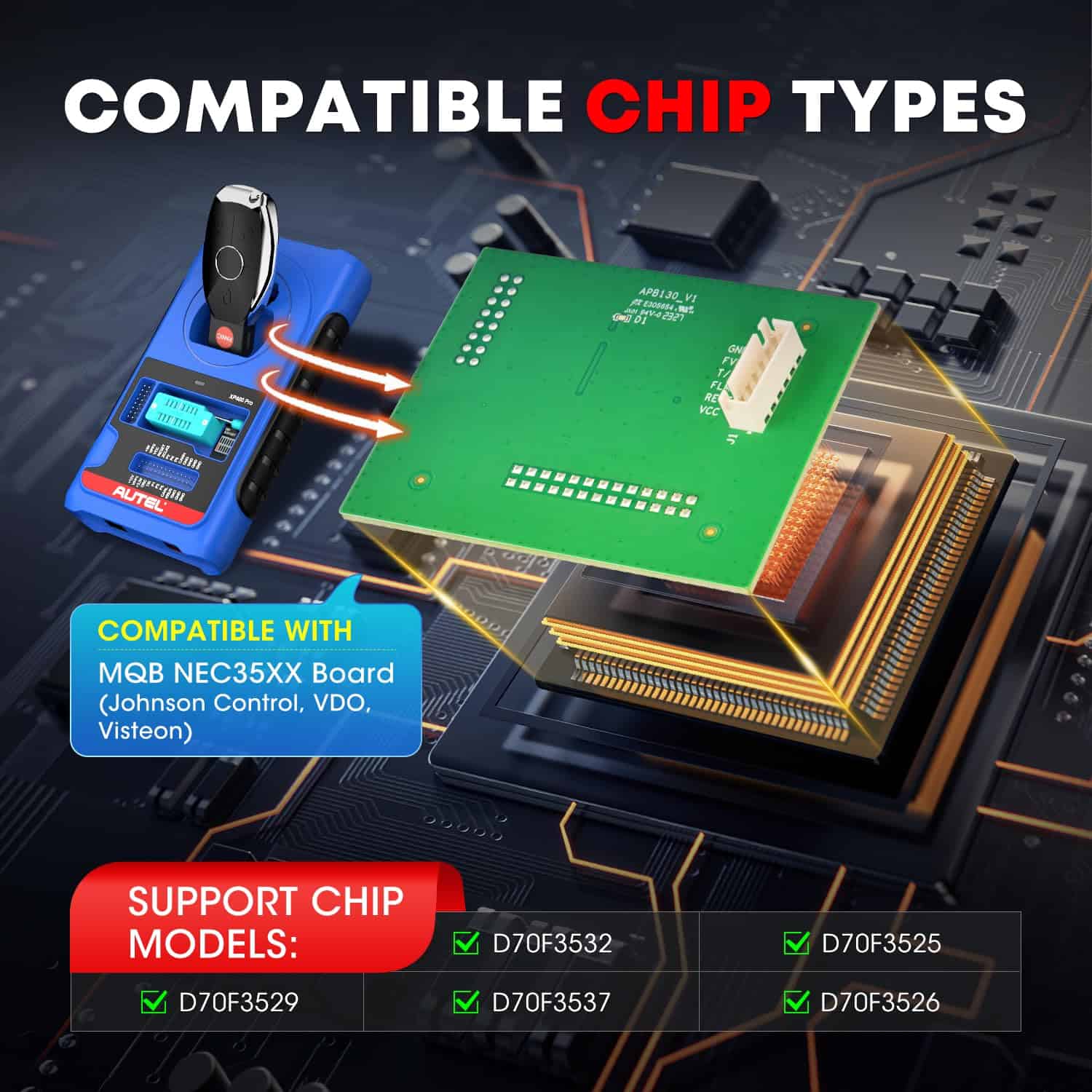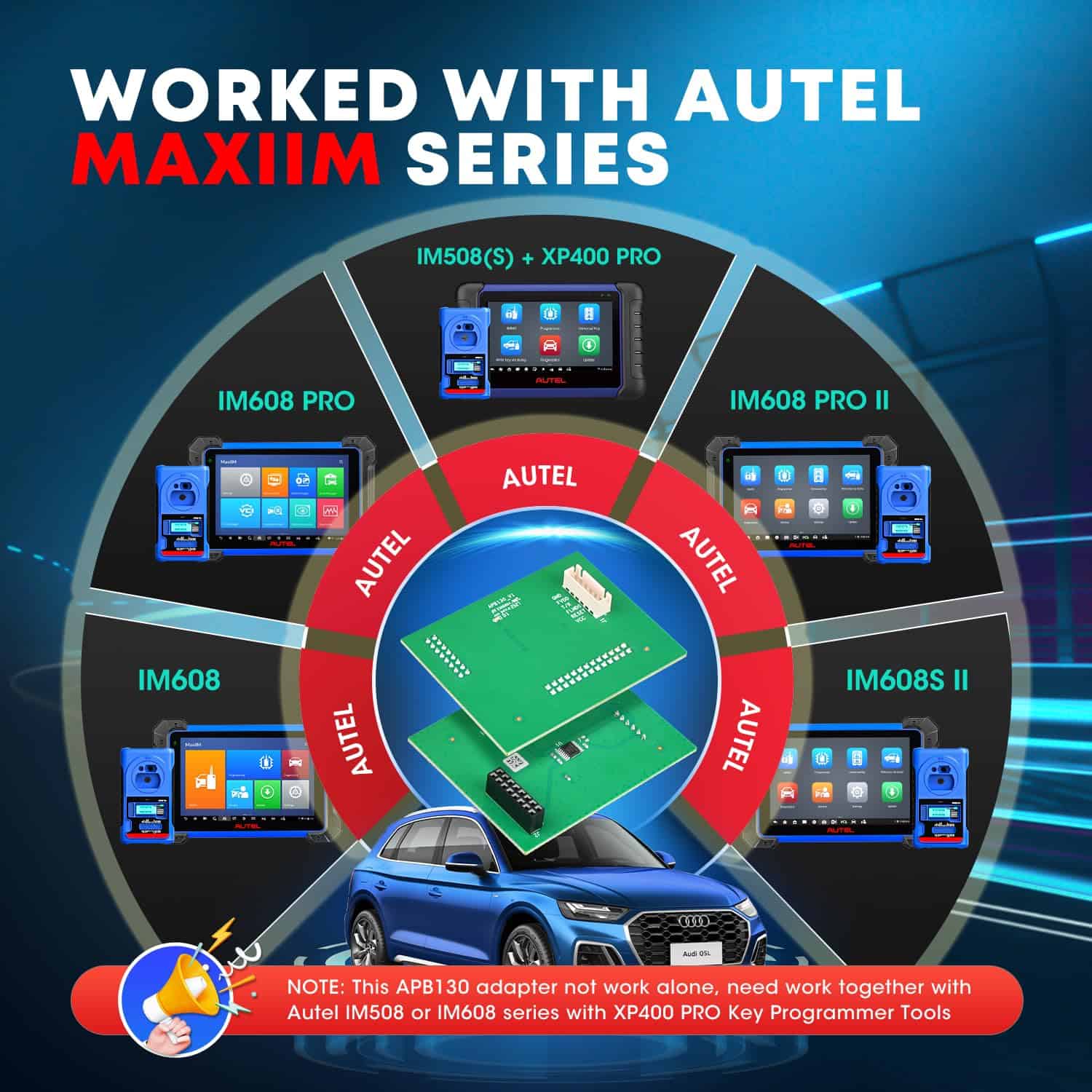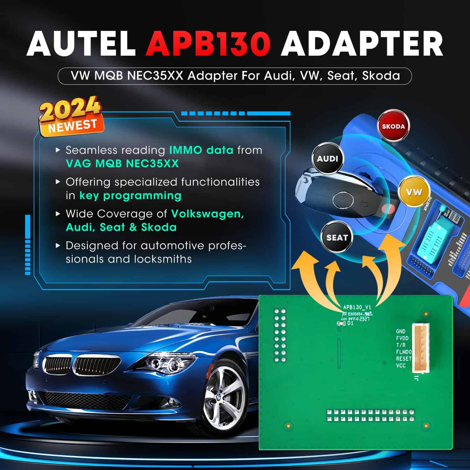 La serie Autel MaxiIM ha lanzado una nueva actualización de software V.A.G. que permite leer datos de inmovilizador del panel V.A.G MQB48 Series NEC35XX. El APB130, junto con el XP400 Pro, te permitirá agregar la llave y leer los datos de inmovilizador para V.W MQB NEC35XX, así como varios vehículos compatibles. Compatible con Autel IM508S, IM608 PRO II (IM608 II), IM608S II, IM508, IM608 PRO con XP400 Pro