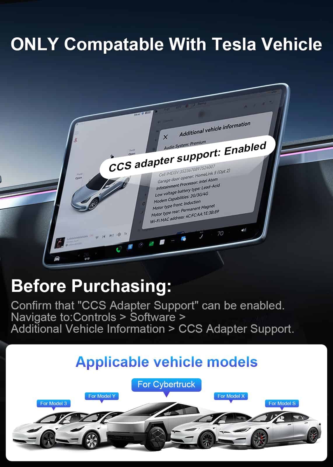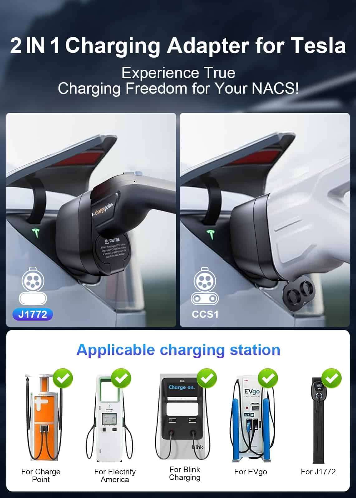 El Adaptador de Carga 4 en 1 CCS & J1772 a NACS para Tesla Model 3/Y/S/X/Cybertruck desbloquea las capacidades de carga rápida al eliminar la necesidad de encontrar cargadores compatibles y abordar problemas de incompatibilidad. Compatible con más de 5,000 estaciones de carga CCS en Norteamérica, incluyendo Blink Charging, EVgo, Electrify America y más, este adaptador empodera a tu Tesla con acceso a carga rápida de nivel 1 a nivel 3 y soporte completo para todo equipo de carga AC J1772. Antes de usarlo, verifica la compatibilidad con tu Tesla a través de nuestras notas de compatibilidad. El adaptador ha sido diseñado con materiales de primera calidad para un rendimiento excepcional en seguridad y durabilidad. Cada adaptador ha pasado más de 20,000 pruebas de inserción y extracción y puede soportar 4,700 libras de carga, garantizando fiabilidad a largo plazo. Compacto y ligero, este adaptador es esencial tanto para aventuras al aire libre como para ser un cargador de respaldo confiable en casa.