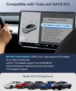 1. VERIFICACIÓN DE COMPATIBILIDAD: El adaptador de carga ChargeWell CCS1 a CCS está diseñado para Tesla Model Y/3/X/S/CyberTruck con compatibilidad habilitada para CCS. NOTA: Asegúrese de que su Tesla admita CCS navegando a: Control > Software > Información Adicional del Vehículo > Soporte del Adaptador CCS para verificar si está habilitado.