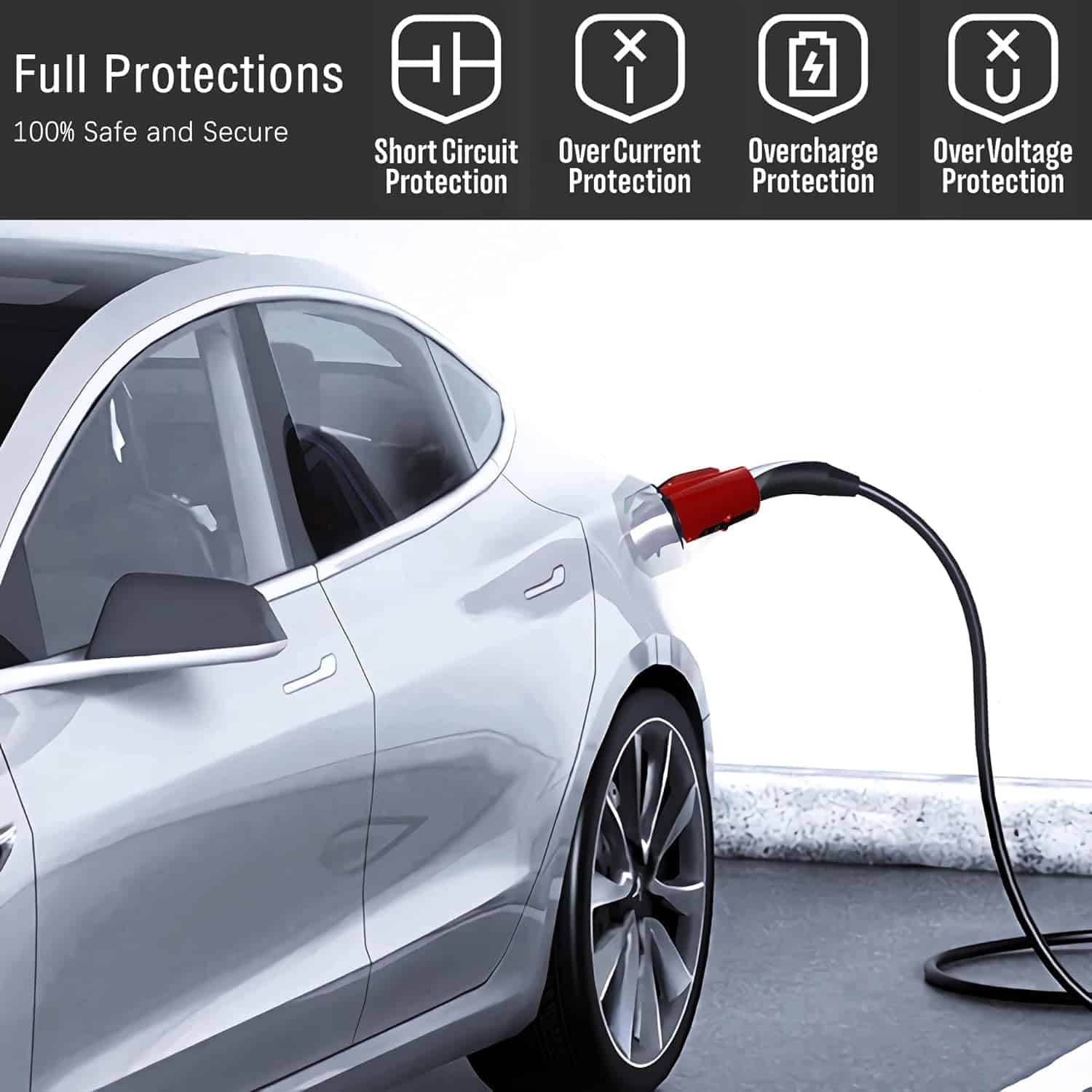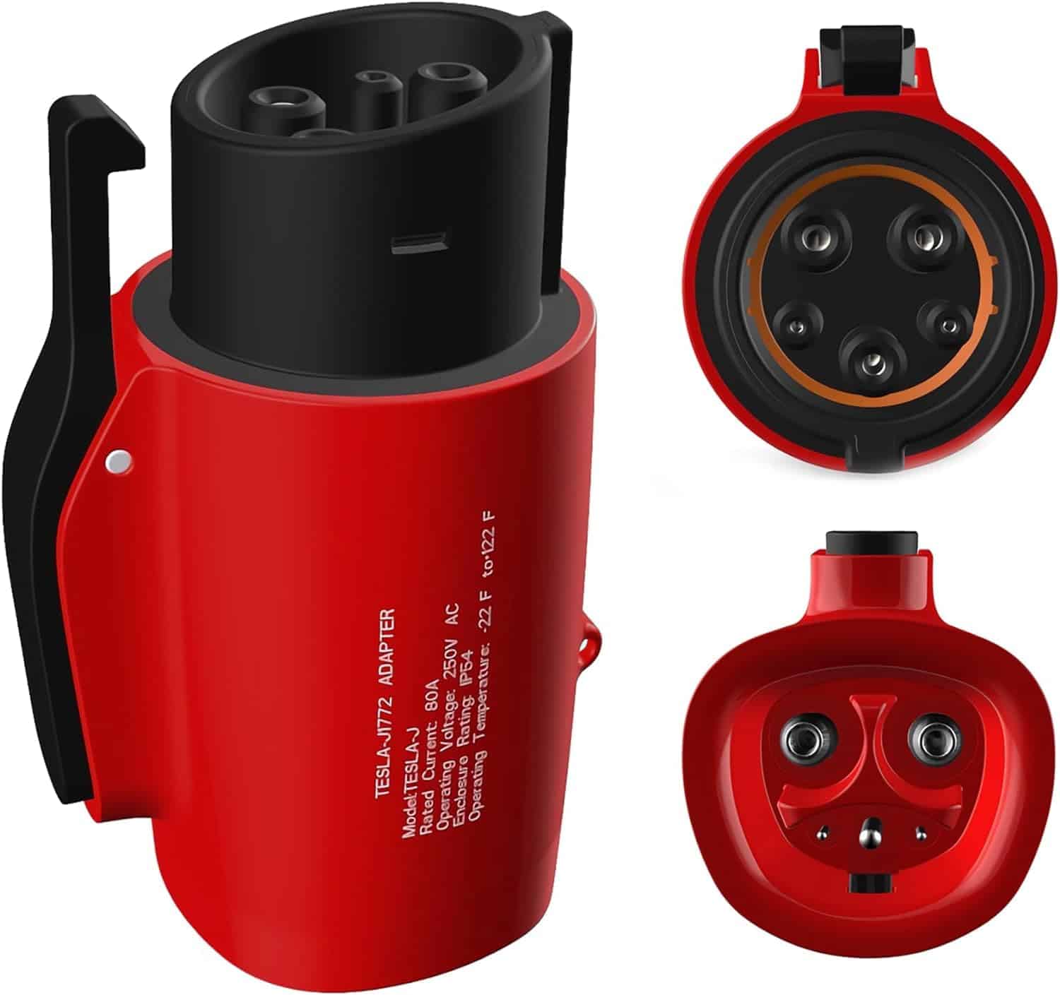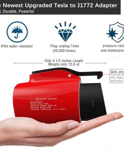 4. & – El adaptador de carga de Tesla a J1772 integra un cierre anticaída, además es resistente al agua IP54 y tiene un rango de temperaturas de funcionamiento de -22 F a 122 F. Puede cargar sus vehículos EV en días nevados y lluviosos.