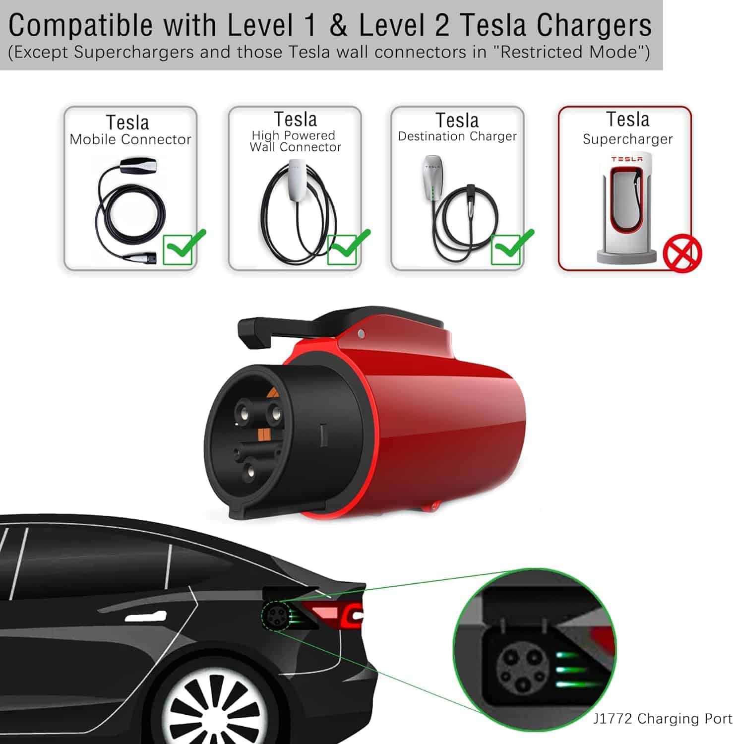 3. – El adaptador de Tesla a J1772 se adapta a cargadores de CA de nivel 1 / nivel 2, y cargadores Tesla que incluyen conectores de pared de Tesla, cargadores de destino y conectores móviles para una carga más conveniente (no funciona con Superchargers de Tesla).