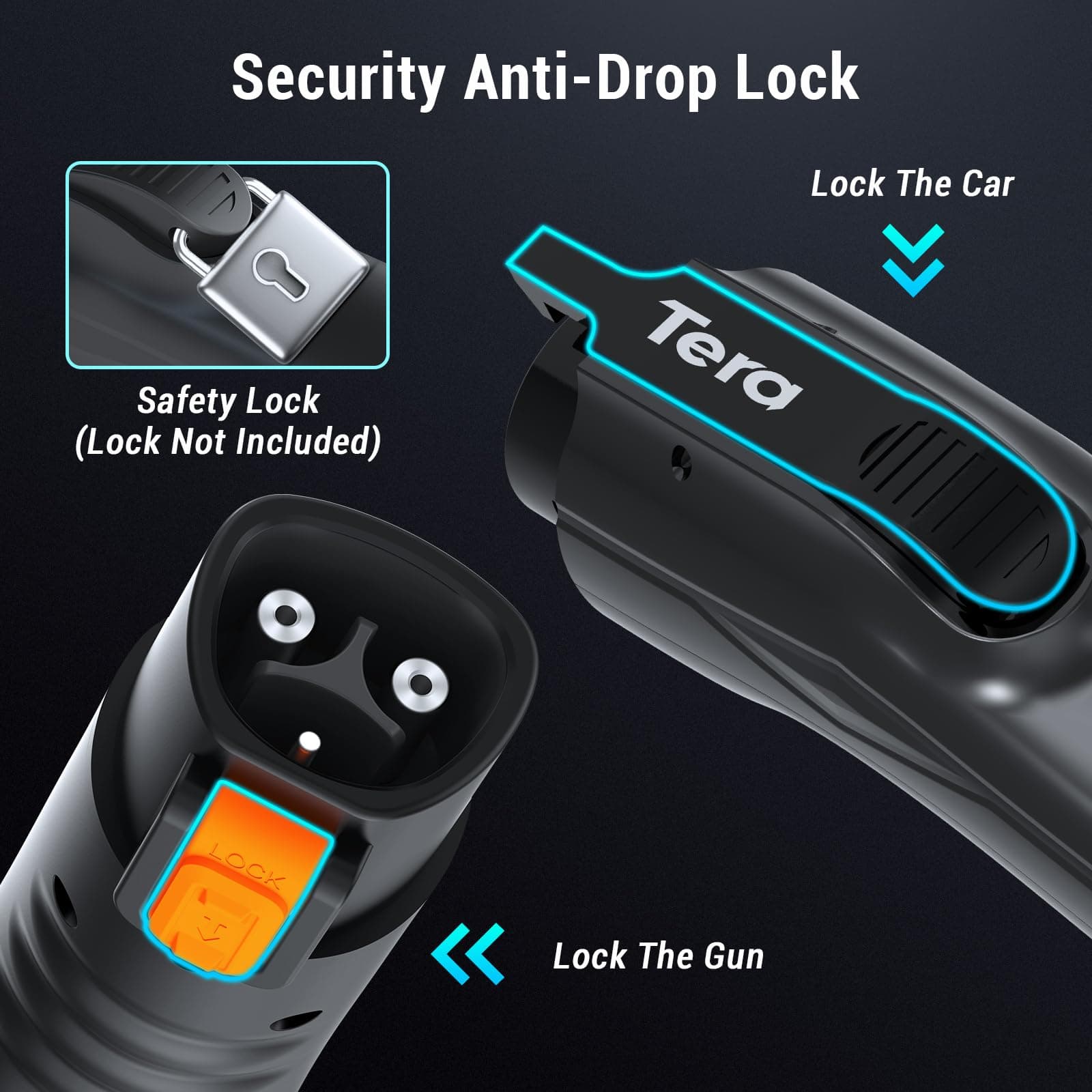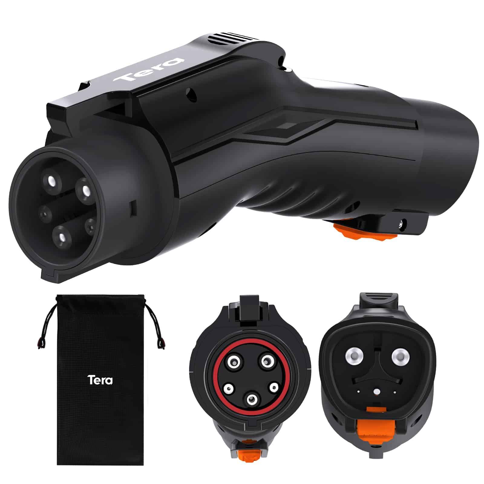 4. Seguridad Bloqueo Anti-Caída El adaptador J1772 de Tera, con su diseño de Bloqueo Anti-Caída, garantiza que el adaptador esté firmemente bloqueado en su lugar durante la carga, reduciendo el riesgo de que se caiga debido a vibraciones o golpes accidentales, protegiendo así tu puerto de carga de daños. Ya sea en casa o en una estación de carga pública, este adaptador ofrece una experiencia de carga más confiable y sin preocupaciones para tu vehículo eléctrico J1772.