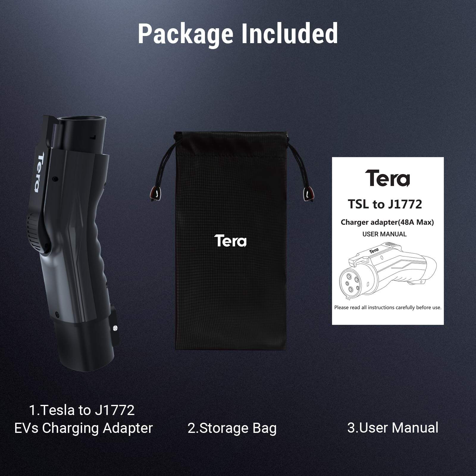 5. Conveniente y Portátil El adaptador de carga de Tesla a J1772 de Tera mide 9 x 3 x 3 pulgadas, proporcionando una conveniencia inigualable tanto si lo estás instalando como si lo estás llevando contigo. Su tamaño portátil, que incluye una bolsa de almacenamiento, garantiza que puedas mantenerlo a mano de forma rápida y conveniente para una conversión de carga rápida y conveniente para tu vehículo eléctrico J1772. Paquete Incluye 1x Adaptador de Tesla a J1772, 1x Bolsa de Almacenamiento, 1x Manual del Usuario.