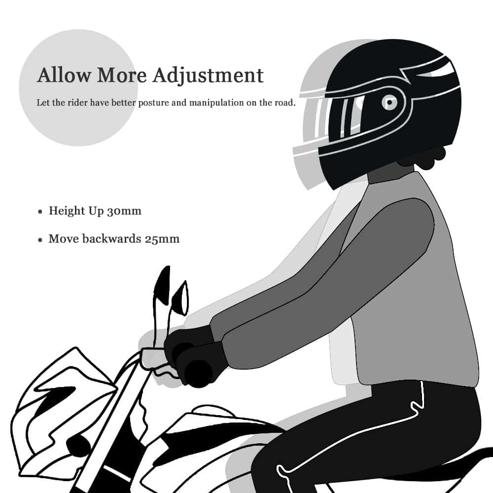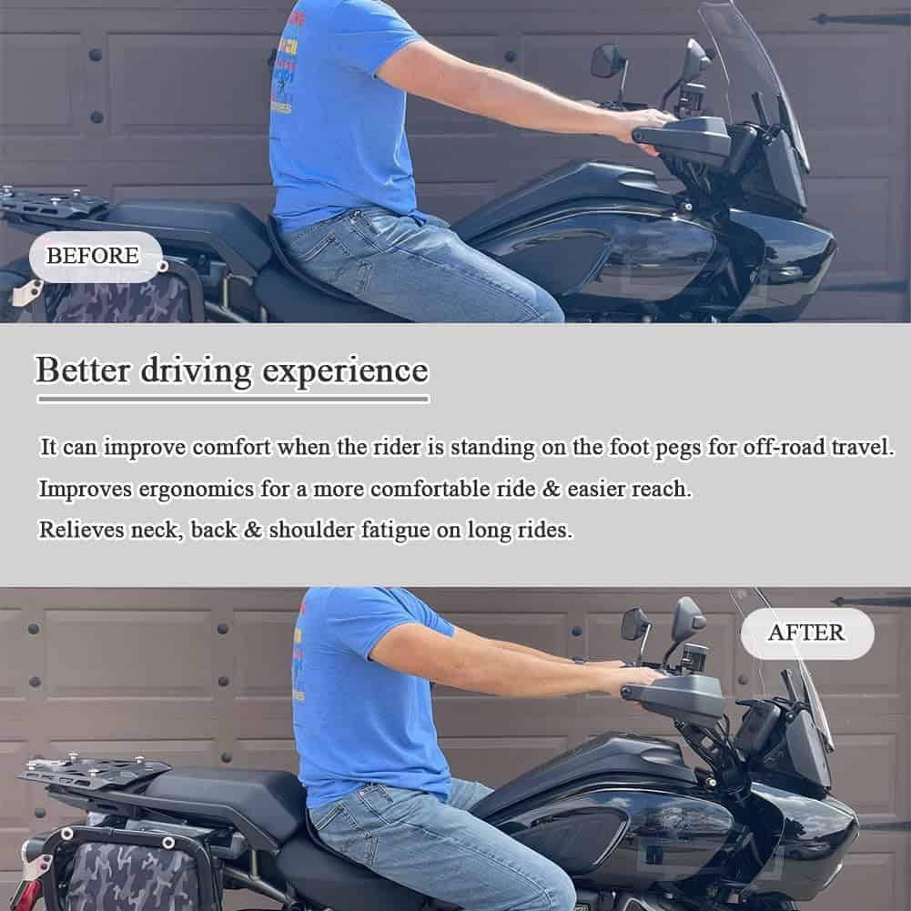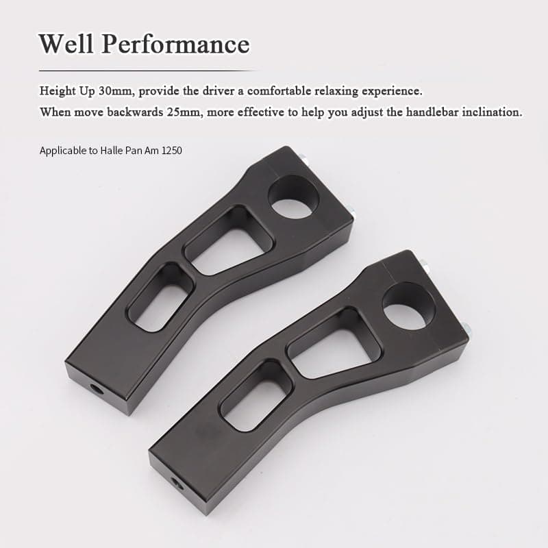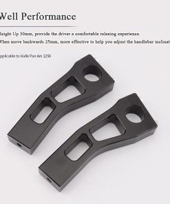 Nombre del artículo: Accesorios para moto Elevador de manillar para Pan America 1250 Material: El elevador de manillar para 1250S está hecho de aluminio sólido para una durabilidad y uso prolongado. Color: Negro, igual que se muestra en las imágenes. Compatibilidad: para Pan America 1250 RA1250 2021-2024; para Pan America 1250 Special RA1250S 2021-2024. Lista de paquetes: 1 par x Kit de elevadores de manillar. Características: – Muy recomendado para 1250 Special, ya que puede mejorar la comodidad cuando el conductor está de pie en los reposapiés para viajes todoterreno. – Mejora la ergonomía para una conducción más cómoda y un alcance más fácil. – Alivia la fatiga de cuello, espalda y hombros en viajes largos. – Puede decorar tu 1250S con un aspecto sobresaliente. – La abrazadera es fácil de instalar sin instrucciones. Consejo útil: 1. Debido a la diferencia de configuración de luz y resoluciones, el color del artículo puede ser ligeramente diferente de las imágenes. 2. Por favor permita diferencias de 1-3mm debido a la medición manual. 3. Por favor, confirme si es adecuado para su motocicleta antes de comprar.