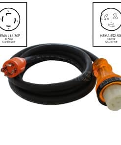 Este adaptador de enchufe AC WORKS� [L1430M50] es perfecto para conectar su generador con un enchufe NEMA L14-30P a un dispositivo de 50 amperios RV/Marino. Con un enchufe macho bloqueable de 30 amperios y un conector hembra de 50 amperios de 4 cables, este adaptador está diseñado para soportar condiciones exteriores difíciles gracias a su cable de cobre resistente y su chaqueta de caucho de 600 voltios. ¡Adquiera el suyo ahora y asegure una conexión segura y confiable para sus dispositivos de alta potencia!