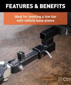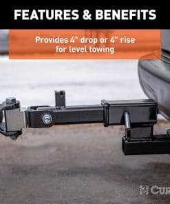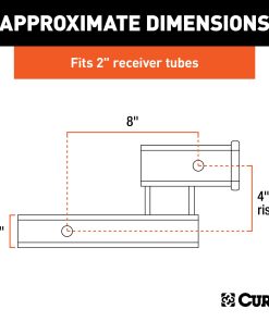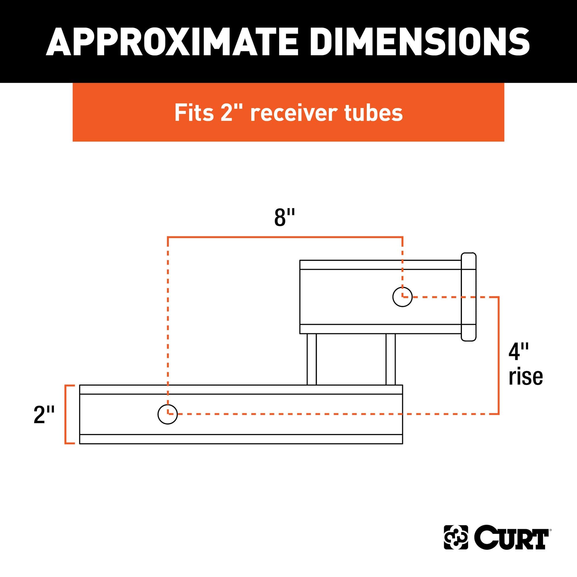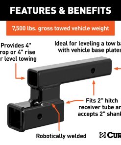 Los adaptadores y extensiones de enganche de CURT son fáciles de usar y ayudan a proporcionar un remolque nivelado para su remolque. Este adaptador de receptor de enganche está diseñado para adaptarse a una abertura de tubo de 2 pulgadas x 2 pulgadas. No solo extiende el receptor, sino que también proporciona 4 pulgadas de caída o 4 pulgadas de subida. Es ideal para ajustar la altura de un soporte de bola, rack de bicicletas u otros accesorios de remolque. Tiene una capacidad máxima de peso de 7,500 libras. Esta extensión de adaptador de receptor levantado también es ideal para remolcar vehículos, lo que le permite nivelar su barra de remolque con las placas base del vehículo. Los adaptadores de enganche de CURT están fabricados para ser duraderos y confiables. Este adaptador de desenganche descendente cuenta con una construcción robusta de acero, soldadura precisa y un acabado duradero de pintura en polvo negro para una resistencia duradera contra el óxido, la descamación y el daño UV.