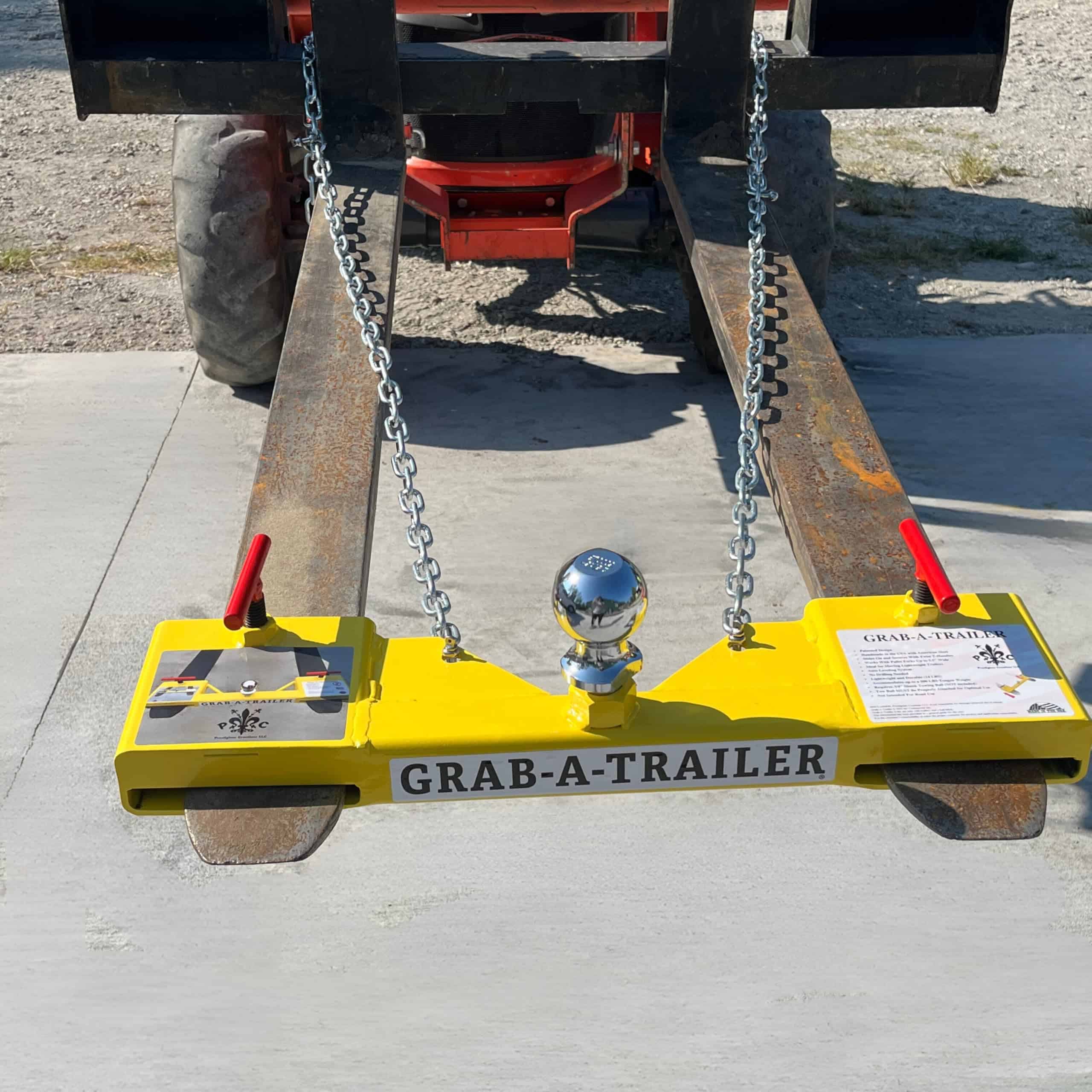 Transforma tu montacargas en una máquina ligera de mover remolques de precisión con el GRAB-A-TRAILER (GAT). El GAT es el accesorio esencial de horquilla de paletas para maniobrar sin esfuerzo remolques ligeros. Este innovador adaptador de enganche convierte de inmediato tu equipo de horquilla doble en una herramienta versátil para mover remolques con un peso de lengüeta de hasta 500 libras, lo que lo hace perfecto para botes más pequeños, remolques de utilidad y equipos remolcables. Diseñado para una visibilidad superior y facilidad de uso, el GAT te permite enganchar y mover remolques ligeros en espacios estrechos, eliminando la necesidad de observadores o maniobras de respaldo difíciles. Simplemente deslízalo sobre tus horquillas dobles, aprieta los cierres en T, coloca tu bola de enganche (no incluida) y ¡listo! Para mayor seguridad, puedes usar las barras o placas de acero en ángulo de 45 grados, dependiendo del modelo, para una fácil fijación de cadena (cadenas no incluidas) y asegurar de forma segura la carga a tu equipo. Fabricado en acero tubular resistente a la intemperie recubierto de polvo y pesando menos de 15 libras, este accesorio ligero mide 24″ de largo x 6″ de ancho x 3″ de alto. Está diseñado para equipos con horquillas de paletas de hasta 5.5″ de ancho. El GAT viene en dos variaciones para adaptarse a las necesidades de muchos: uno que se adapta a bolas de enganche con una barra de 1″ y otro que acomoda bolas de enganche con una barra de 3/4″ o 1″. La barra de 1 pulgada se adapta a una bola de enganche de hasta 2 pulgadas y la de 1 pulgada se adapta a un enganche de hasta 2 pulgadas. El GAT es compatible con montacargas, skid steers, deslizadores de tractor y retroexcavadoras, lo que lo hace ideal para marinas, pequeños talleres, granjas y sitios de construcción de servicio ligero. Su diseño patentado, fabricado con orgullo en EE.UU. por Prestigious Creations LLC utilizando acero 100% estadounidense, garantiza que cada GRAB-A-TRAILER se fabrique con precisión para aumentar tu productividad al manipular remolques ligeros.