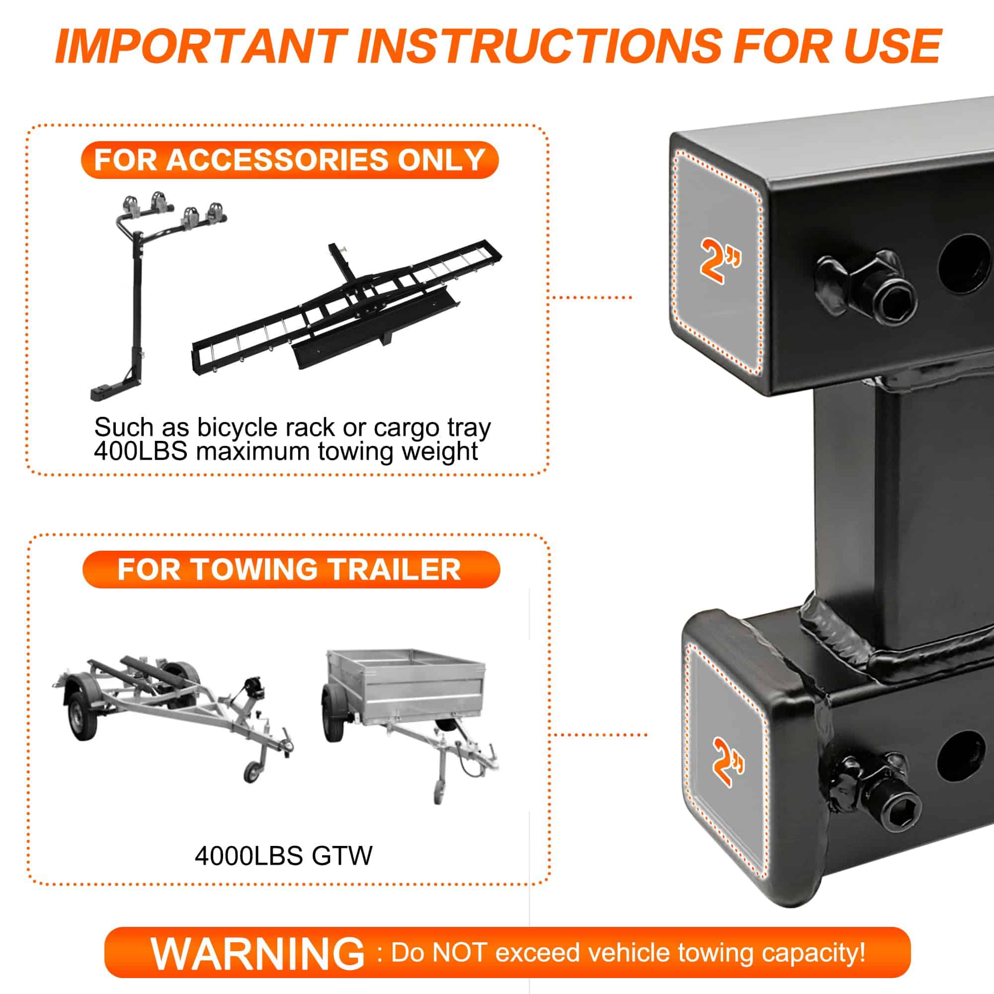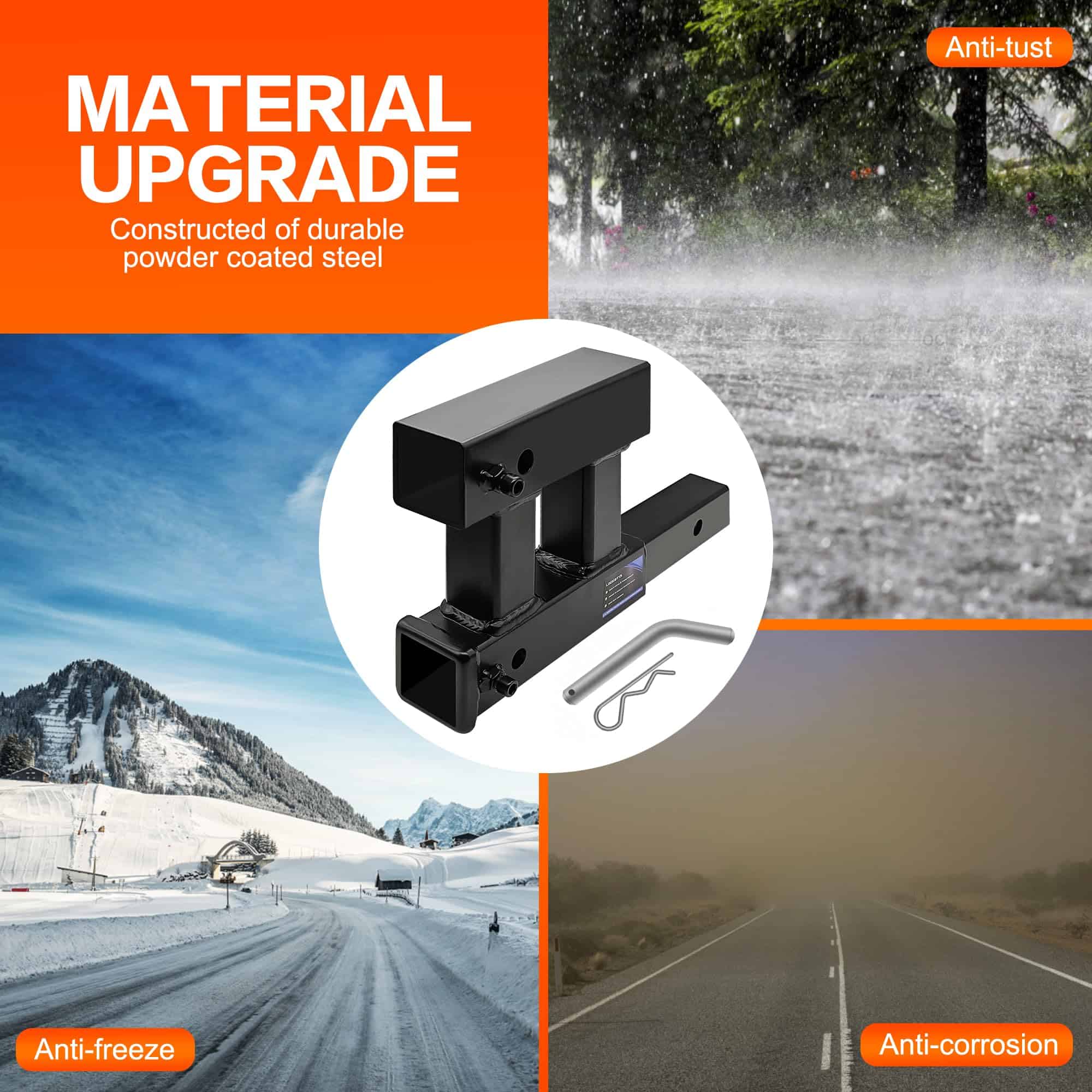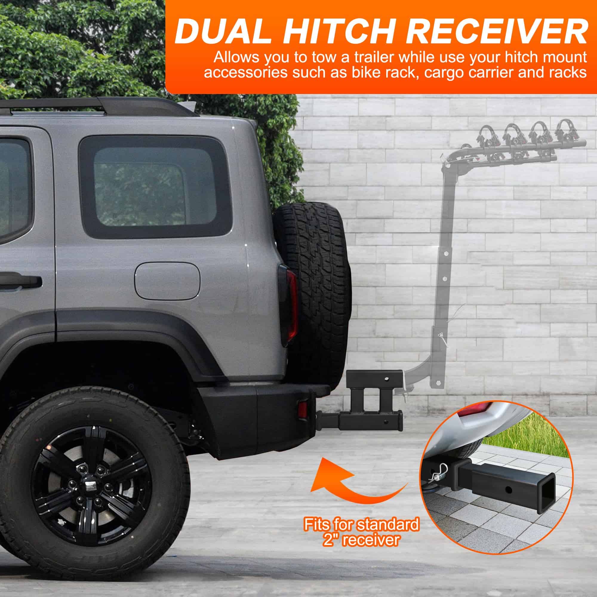 1. COMPATIBILIDAD: La extensión de doble receptor se ajusta para receptores de remolque estándar de 2″ clase III y clase IV, utiliza un pasador de 5/8″ para conectarse a su vehículo, y convierte un solo receptor en dos y le permite remolcar un remolque mientras usa sus accesorios de montaje de receptor como portabicicletas, portaequipajes y racks.