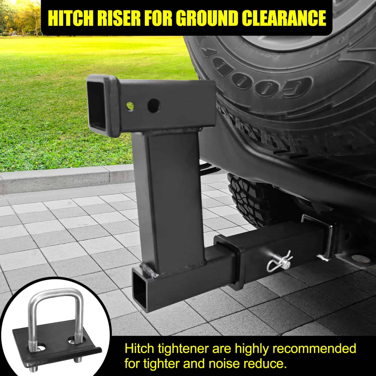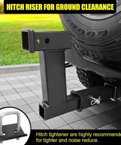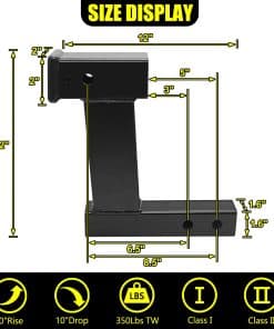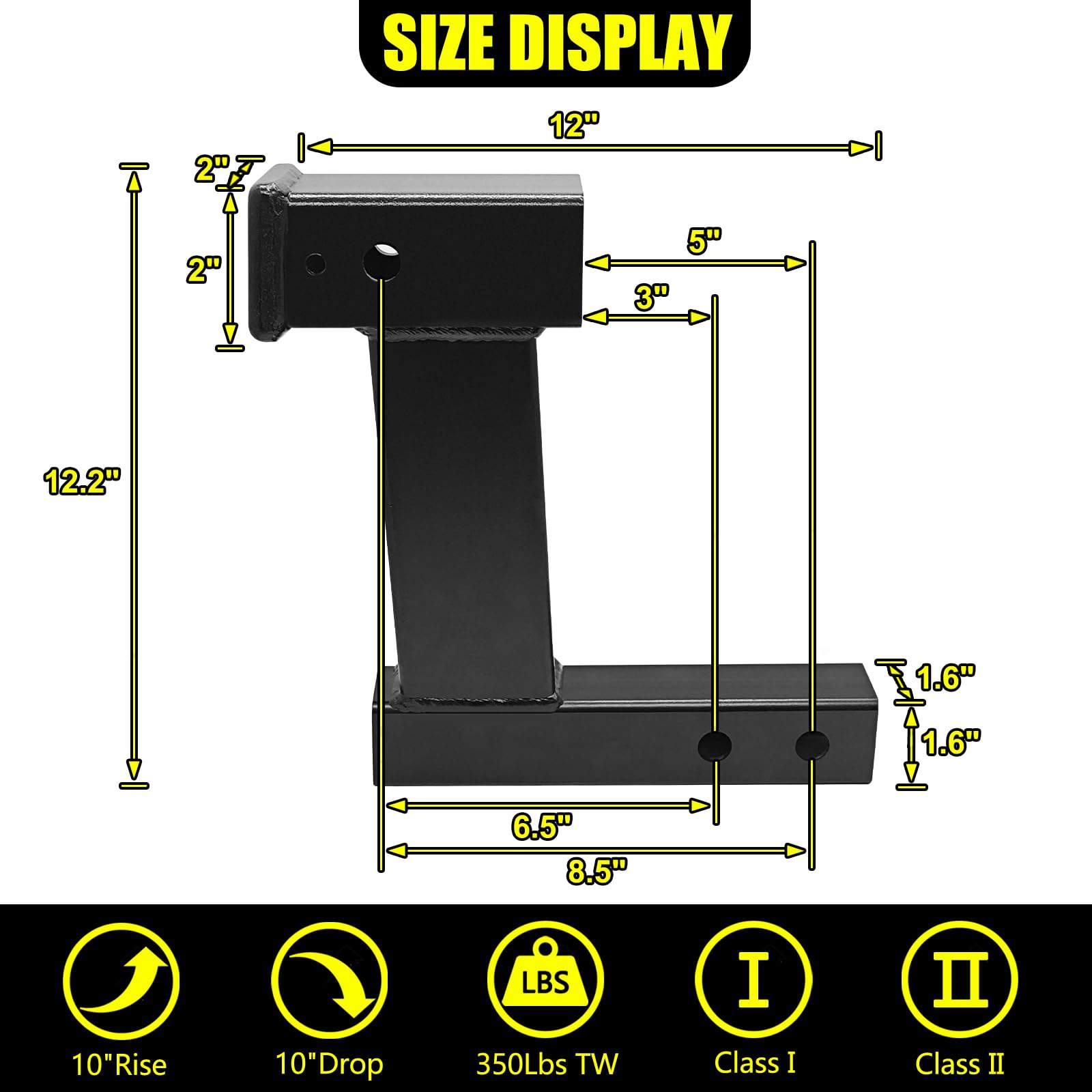 Por favor verifique las dimensiones del producto (es decir, bajada, levantamiento, longitud del extensor, tamaño del vástago, tamaño del receptor, etc.) antes de la compra. Tamaño del receptor: Este extensor de enganche de remolque tiene un receptor estándar de la industria de 2 pulgadas por 2 pulgadas, se ajusta a la mayoría de los vástagos de 2 pulgadas de enganches de bola, soportes para bicicletas, portacargas y otros accesorios de enganche. Levantamiento o bajada del enganche: Este enganche de remolque de 10 pulgadas de levantamiento o bajada se puede girar hacia arriba o hacia abajo para nivelar el sistema de remolque. Longitud ajustable: El diseño de 2 agujeros de pasador hace que este enganche de remolque ajustable tenga 2 longitudes activas (8″ y 10″) y evite interferir con el parachoques del vehículo. Capacidad: Peso bruto de remolque: 7500 libras. Peso de la lengüeta: 350 libras. Se ajusta a la mayoría de los receptores de enganche de 2″. Resistente para remolcar remolques, barcos, campers, portabicicletas, portacargas, etc. Tamaño del receptor: 2 pulgadas por 2 pulgadas. Con dispositivo de perno antirroce.