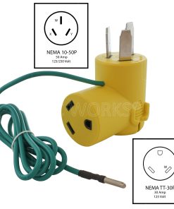 Este adaptador de RV de la marca AC WORKS, modelo RV1050TT, es un NEMA 10-50P a NEMA TT-30R. El NEMA 10-50P es una clavija macho antigua de soldador/rango de 50 amperios, 125/250 voltios y 3 puntas. El NEMA TT-30R es un conector hembra de RV de 30 amperios y 125 voltios. Este adaptador tiene una potencia de operación máxima de 3750 vatios y cuenta con una garantía limitada de 5 años. Características: Adaptador de RV de 30 amperios, Conecta un conjunto de cordón de RV estándar de 30 amperios a una conexión antigua de soldador/rango, Clavija macho de 3 puntas de 50 amperios, 125/250 voltios, NEMA 10-50P, Conector hembra de 30 amperios, 125 voltios, NEMA TT-30R para RV, Indicador lumínico de encendido, Garantía limitada de 5 años, Usos comunes: Potencia de RV, Potencia de remolque de viaje, Potencia de camión de comida.