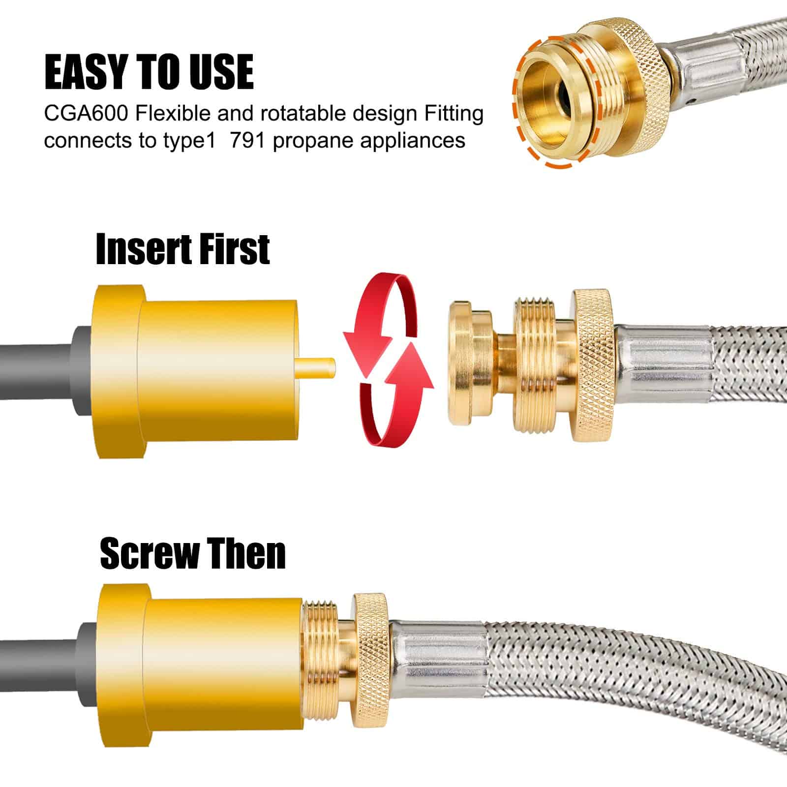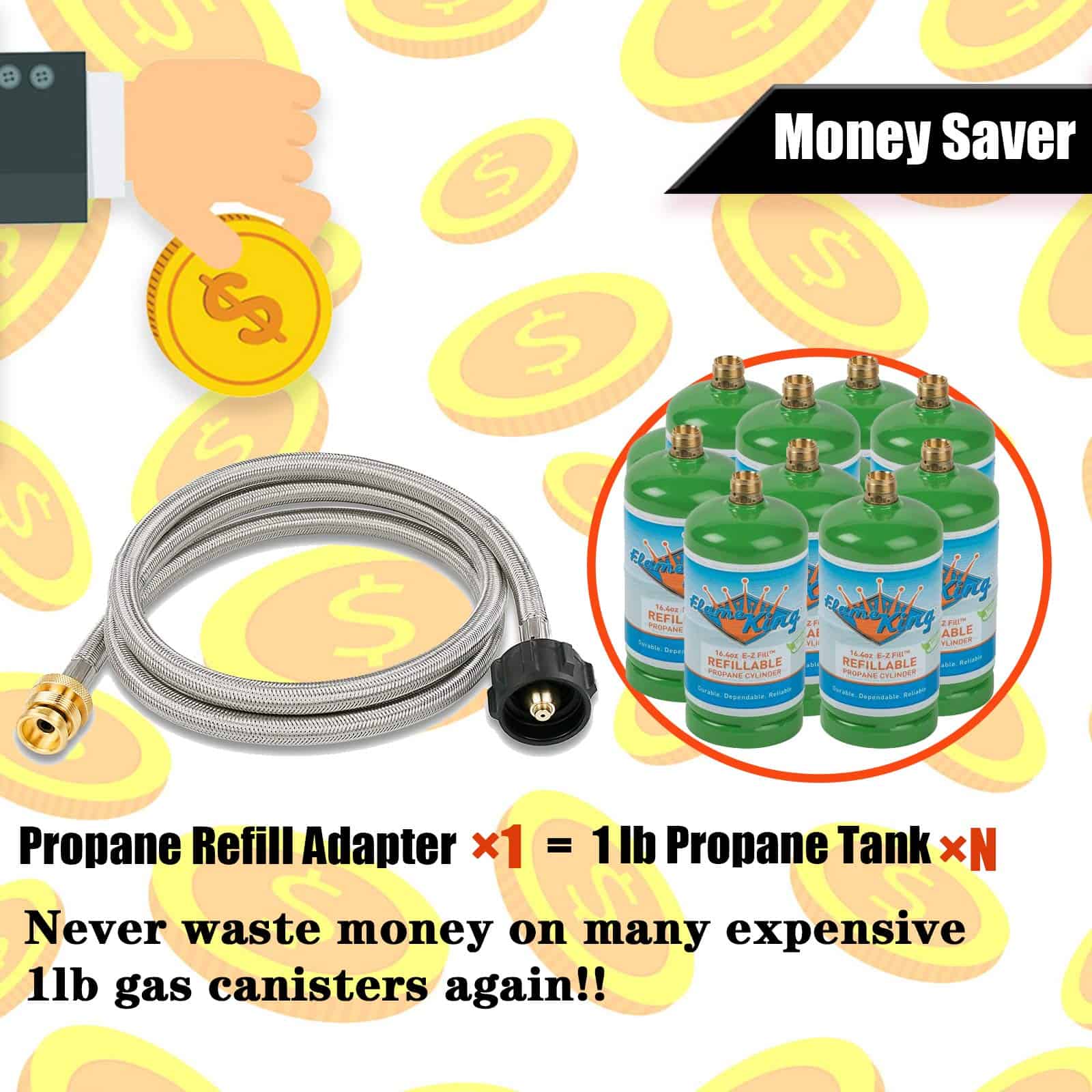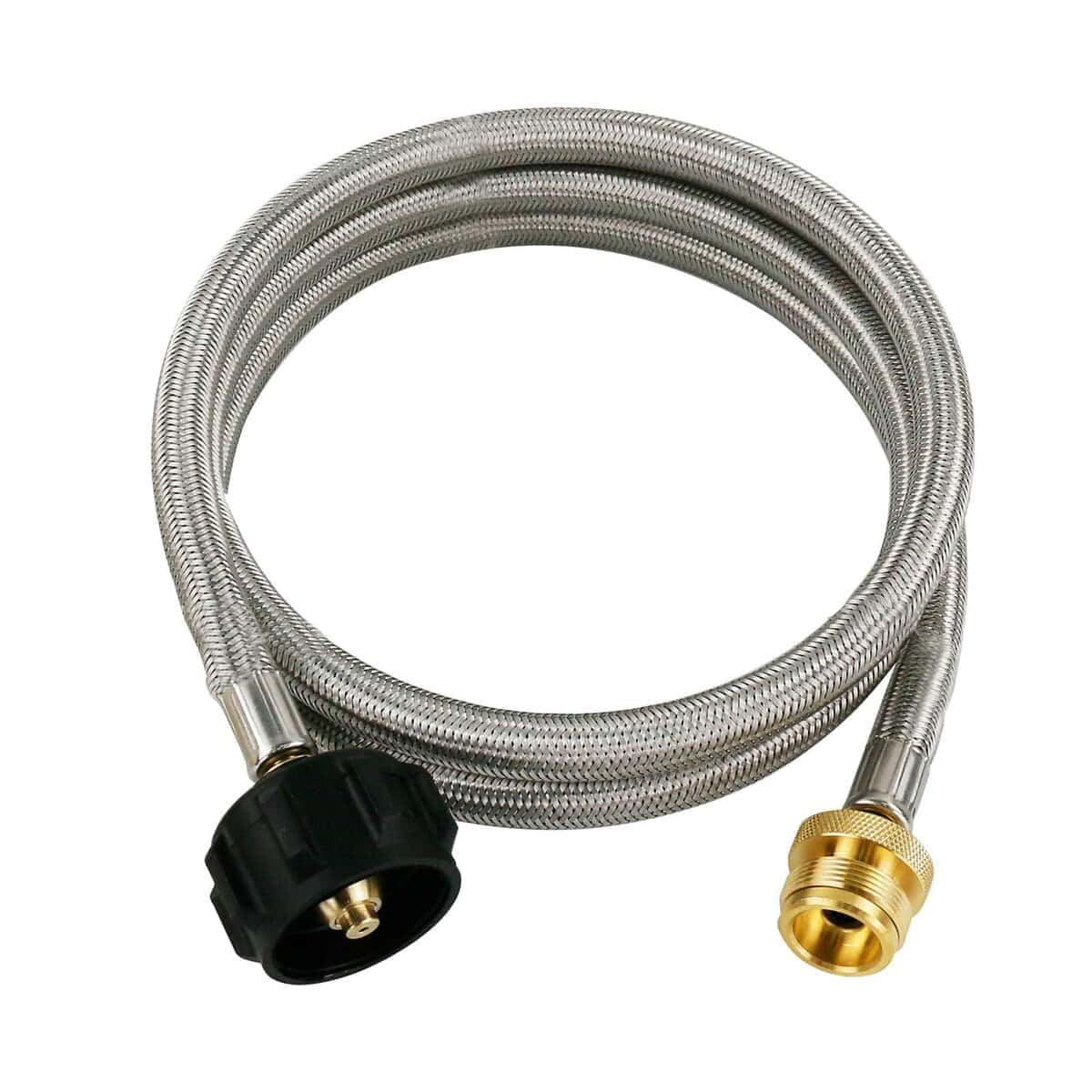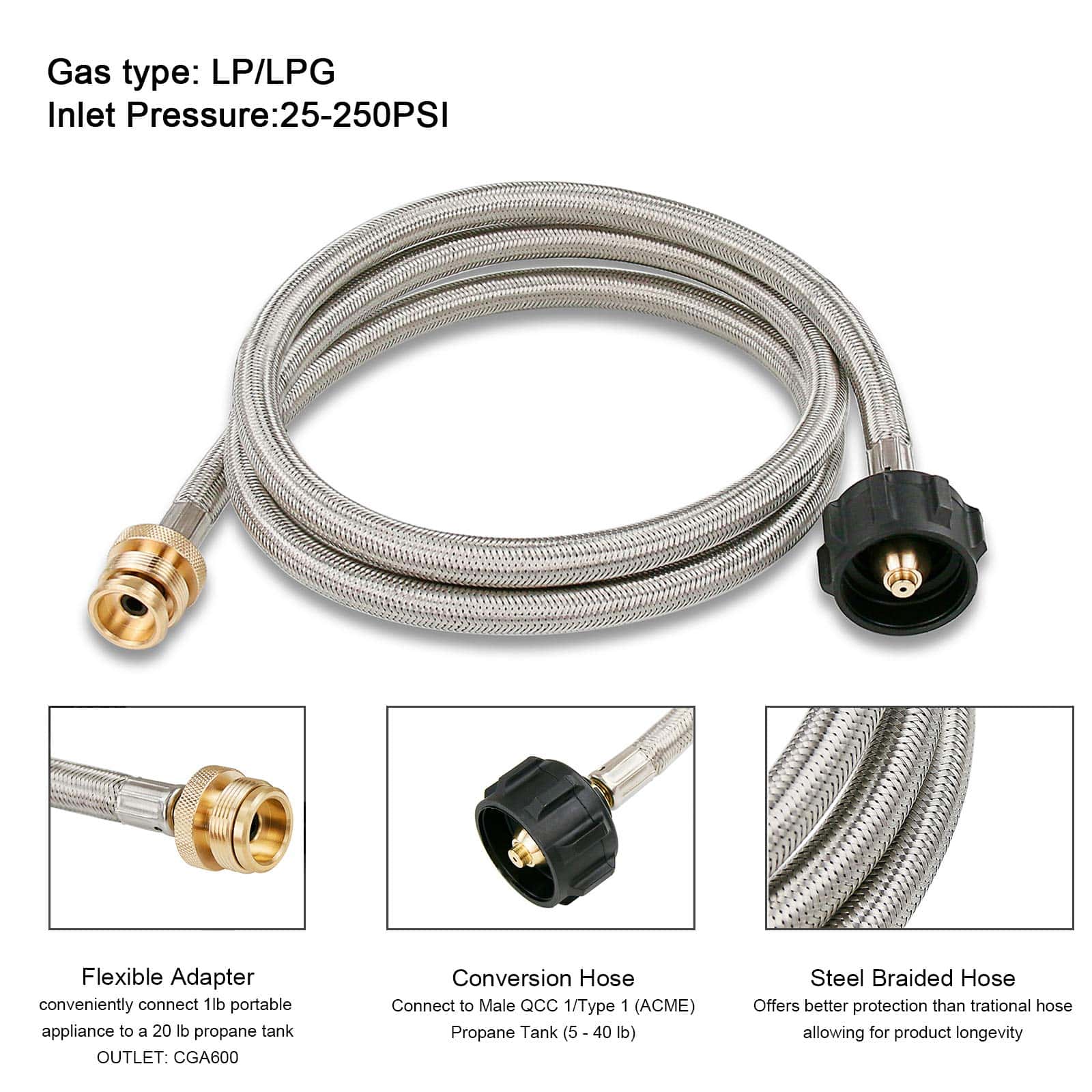 El adaptador de manguera de propano de 5 FT se adapta a todos los electrodomésticos portátiles que usan cilindros de 1 libra. Perfecto para linterna, calentador, estufa de campamento, parrilla portátil, parrilla de mesa, serie Weber Q, estufa de propano Coleman, plancha Blackstone y más dispositivos portátiles. Ideal para acampar, hacer tailgating o tener una comida al aire libre. Compatible con estufa Coleman, parrilla Weber Q, plancha Blackstone, calentador Mr. Heater buddy y más. La manguera trenzada de acero inoxidable es un buen upgrade de la manguera de goma tradicional, ofreciendo una mejor protección y mayor longevidad del producto. Con este adaptador de manguera de propano, ya no tienes que preocuparte por un repentino corte de suministro después de trabajar durante algunas horas en la estufa de propano de cilindro de 1 lb. No solo proporciona más calor, sino que cada cilindro de 1 libra ahorrado es dinero gracias a esta manguera de adaptador de propano. La manguera de conexión flexible y giratoria permite conectar fácilmente el electrodoméstico portátil de Tipo 1 de 1 libra a un tanque de propano de 20 libras, simplemente inserta y atornilla.