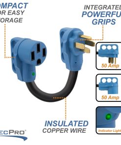 Detalles: Adaptador de energía RV de 50 amperios a 50 amperios Convierte el enchufe de 50AMP en capacidad de enchufe de 50AMP para cambiar la ubicación del enchufe disponible Tipo: enchufe 14-50P a salida 14-50R Calibre del cable: 6/3 + 8/1 | 3 cables @ 6Ga, 1 cable @ 8Ga 12″ de longitud Incluye indicador iluminado para mostrar si la electricidad está fluyendo a través del cable Ambas conexiones incluyen agarres que facilitan y hacen más segura la eliminación 125V/250VCA Aislamiento resistente para trabajos rudos Compacto para un almacenamiento fácil Revestimiento de PVC resistente al fuego y al calor de servicio pesado