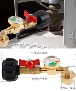 1. Adaptador de 90 grados: Este adaptador de recarga de propano está diseñado con un codo de 90 grados para mejorar el flujo de aire a los cilindros pequeños. El medidor luminoso garantiza la monitorización nocturna del tanque y la válvula de encendido/apagado evita las fugas. Conecta fácilmente tanques de aire grandes a botellas de 1 lb sin necesidad de herramientas adicionales.