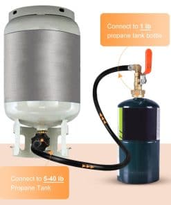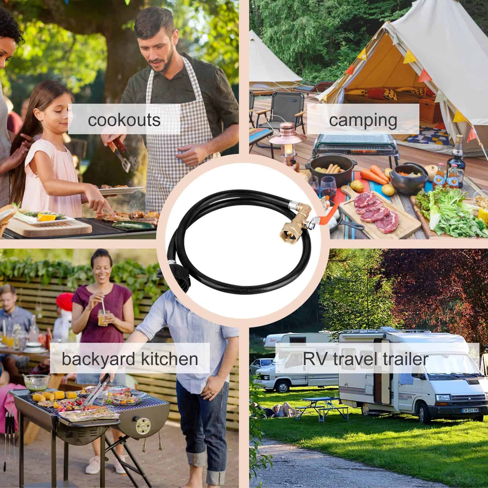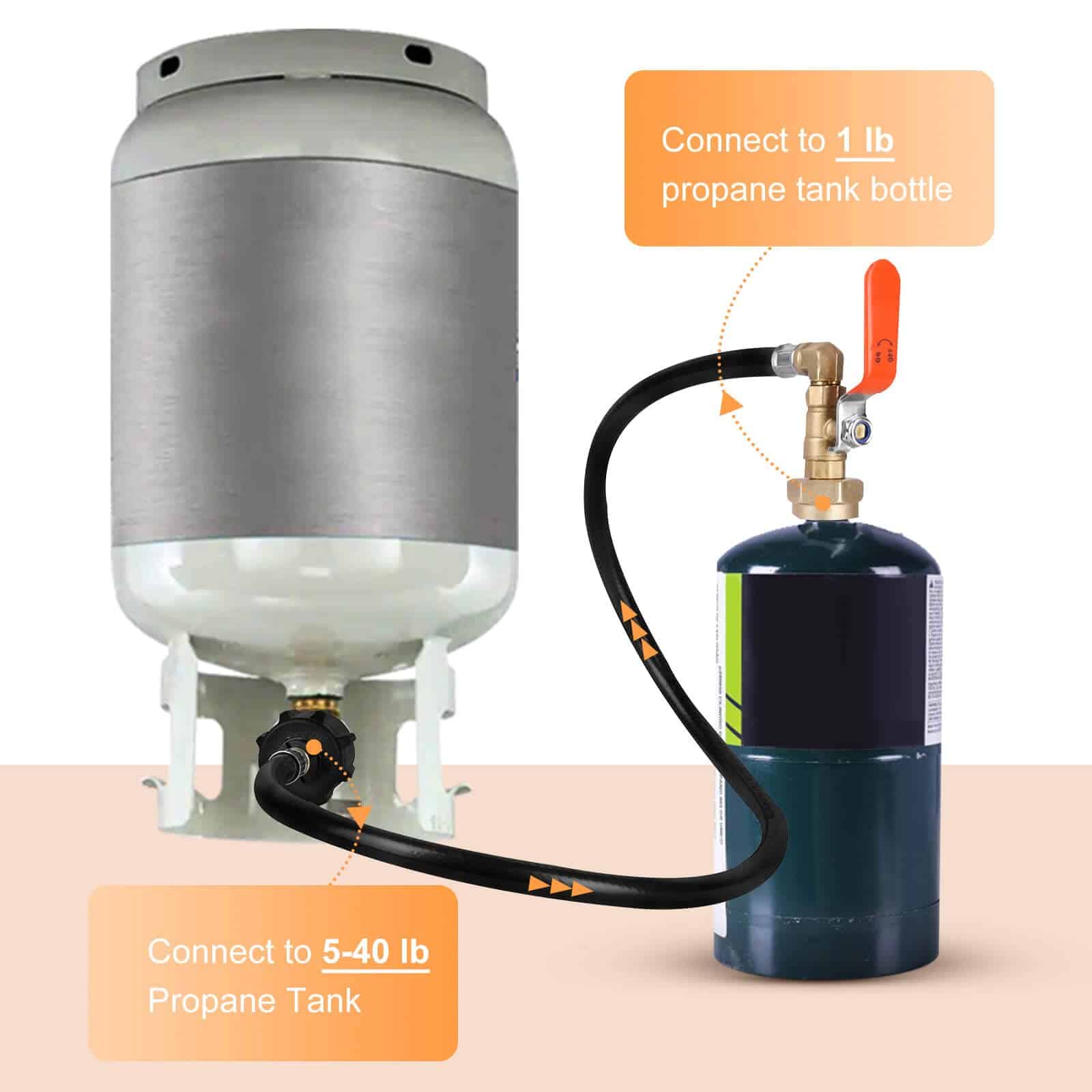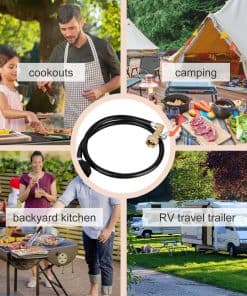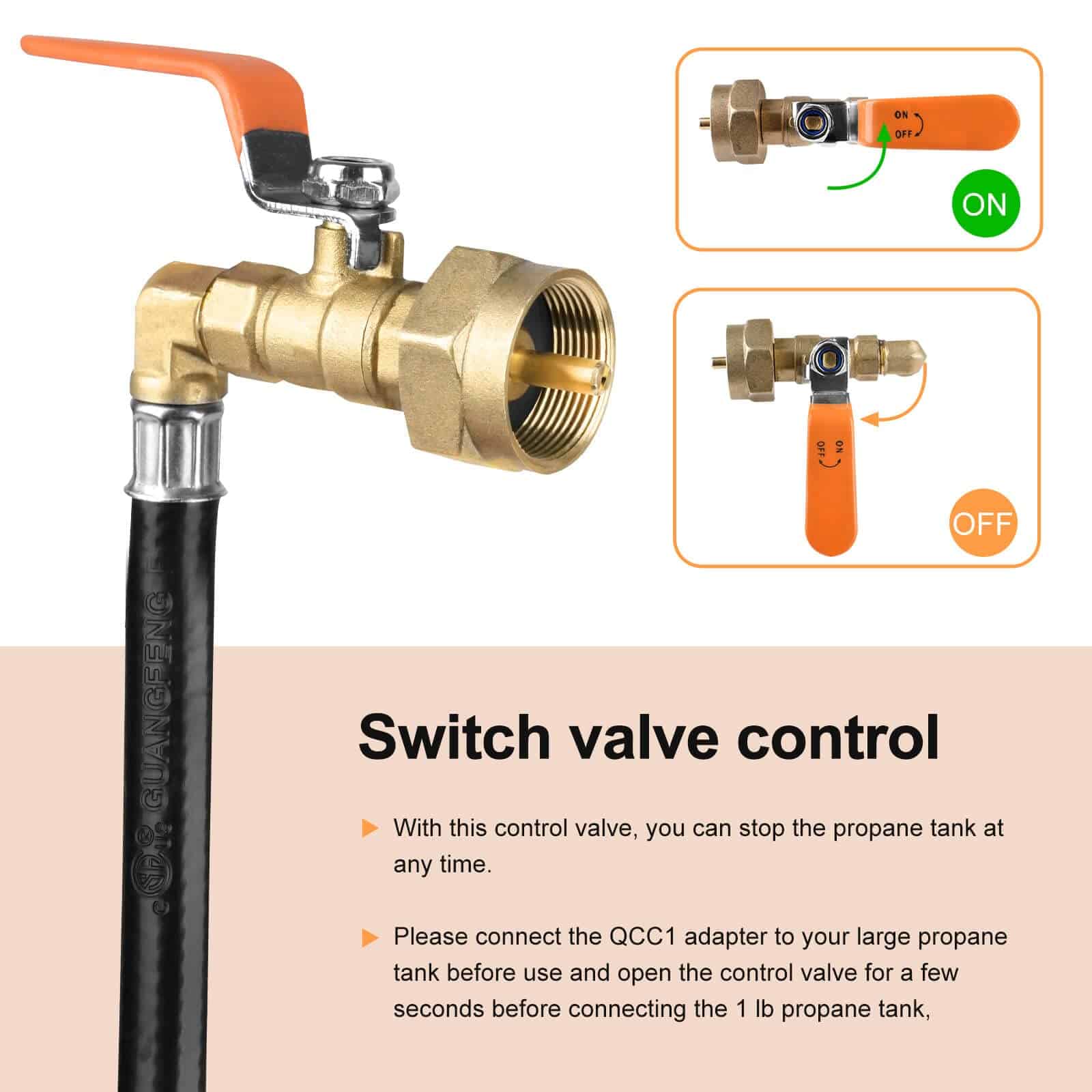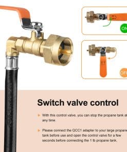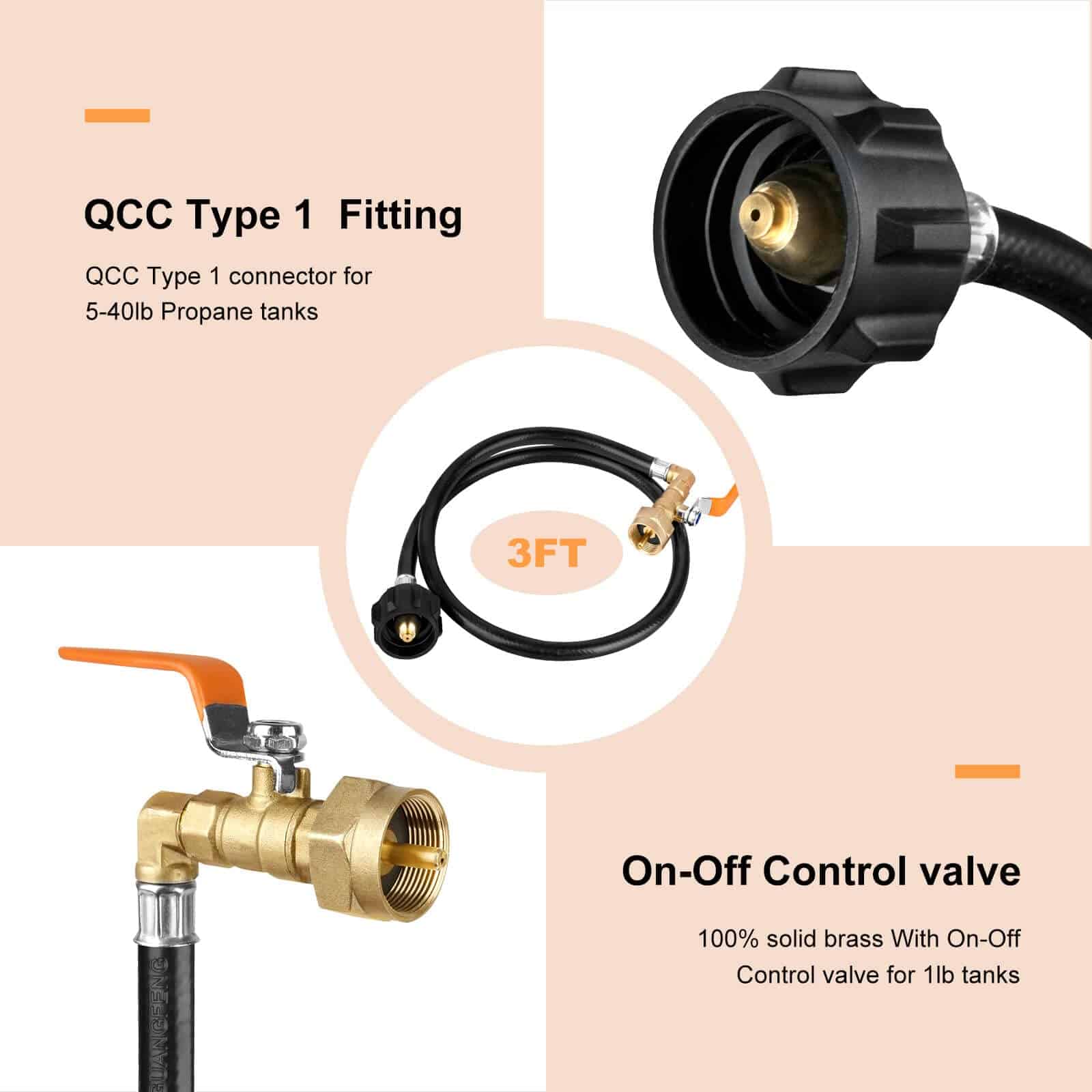 Nombre de las Especificaciones del Producto: Manguera de recarga de propano Longitud: 3 pies 36 pulgadas Material: Caucho, Latón Macizo Conector: QCC1/Type1 y rosca hembra de cilindro desechable de 1″ x 20 Válvula de Control: Válvula de Encendido-Apagado