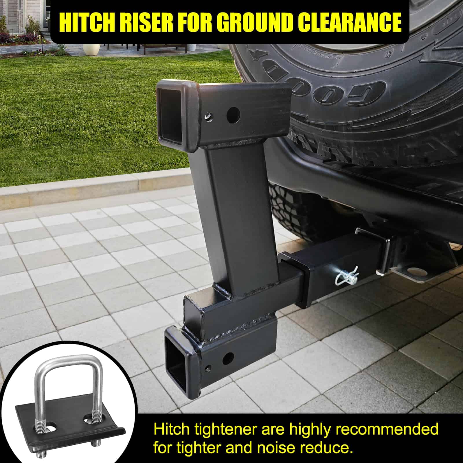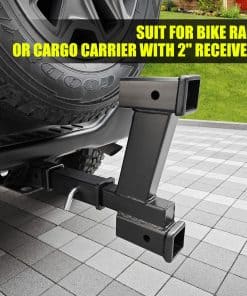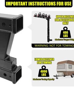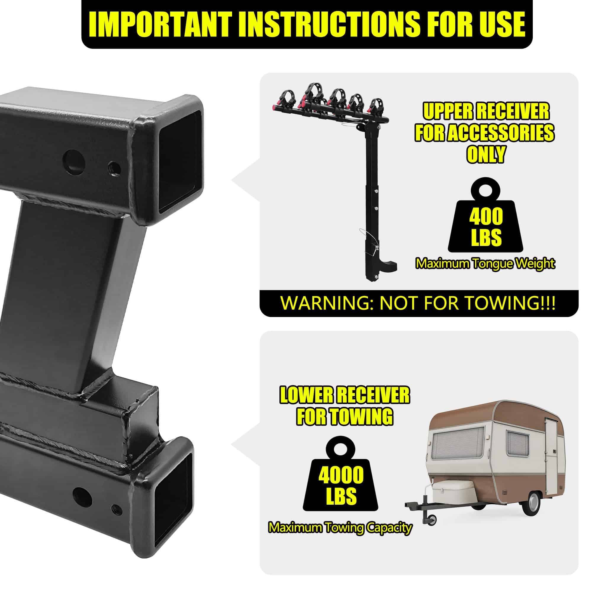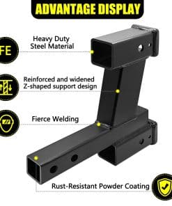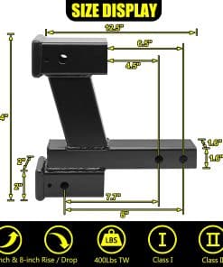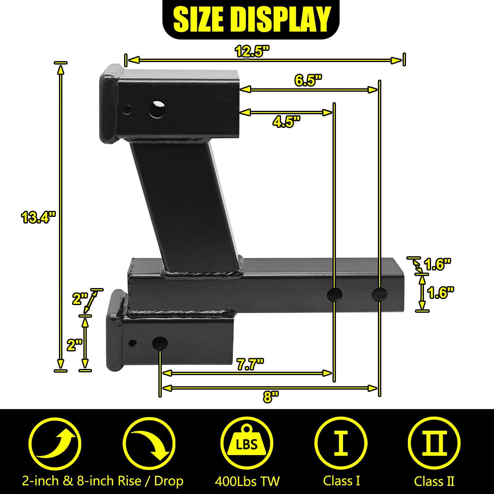 Adaptador de remolque doble KAIRAY con elevador/caída de 2 pulgadas y 8 pulgadas, compatible con receptor de 2 pulgadas, vástago sólido de 2 pulgadas, capacidad de remolque de 10000lbs. Por favor, verifique las dimensiones del producto (caída, elevación, longitud del extensor, tamaño del vástago, tamaño del receptor, etc.) antes de comprar. Tamaño del Receptor: Este extensor de enganche para remolque tiene un receptor estándar de la industria de 2 pulgadas por 2 pulgadas, se adapta a la mayoría de los vástagos de 2 pulgadas de los soportes de bola, portabicicletas, porta equipajes y otros accesorios para enganches. Elevador o Caída de Enganche: La elevación y caída de 2 pulgadas y 8 pulgadas se puede ajustar hacia arriba o hacia abajo para nivelar el sistema de remolque. Longitud Ajustable: El diseño de 2 agujeros para pasadores hace que este enganche de remolque ajustable tenga 2 longitudes activas (8″ y 10″ longitud de agujero a agujero) y evite interferir con el parachoques del vehículo. Capacidad: Peso Bruto Total de Remolque: 10000 libras. Peso de Lengua Total: 400 libras. Se adapta a la mayoría de los enganches de receptor de remolque de 2″. Resistente y duradero para remolcar remolques, barcos, campistas, porta bicicletas, porta equipajes, etc. Tamaño del Receptor: 2 pulgadas por 2 pulgadas. Con dispositivo de tornillo antirruido. Resistente a la corrosión: Fabricado en acero de alta resistencia con un acabado duradero de polvo negro satinado, súper resistente a la corrosión.
