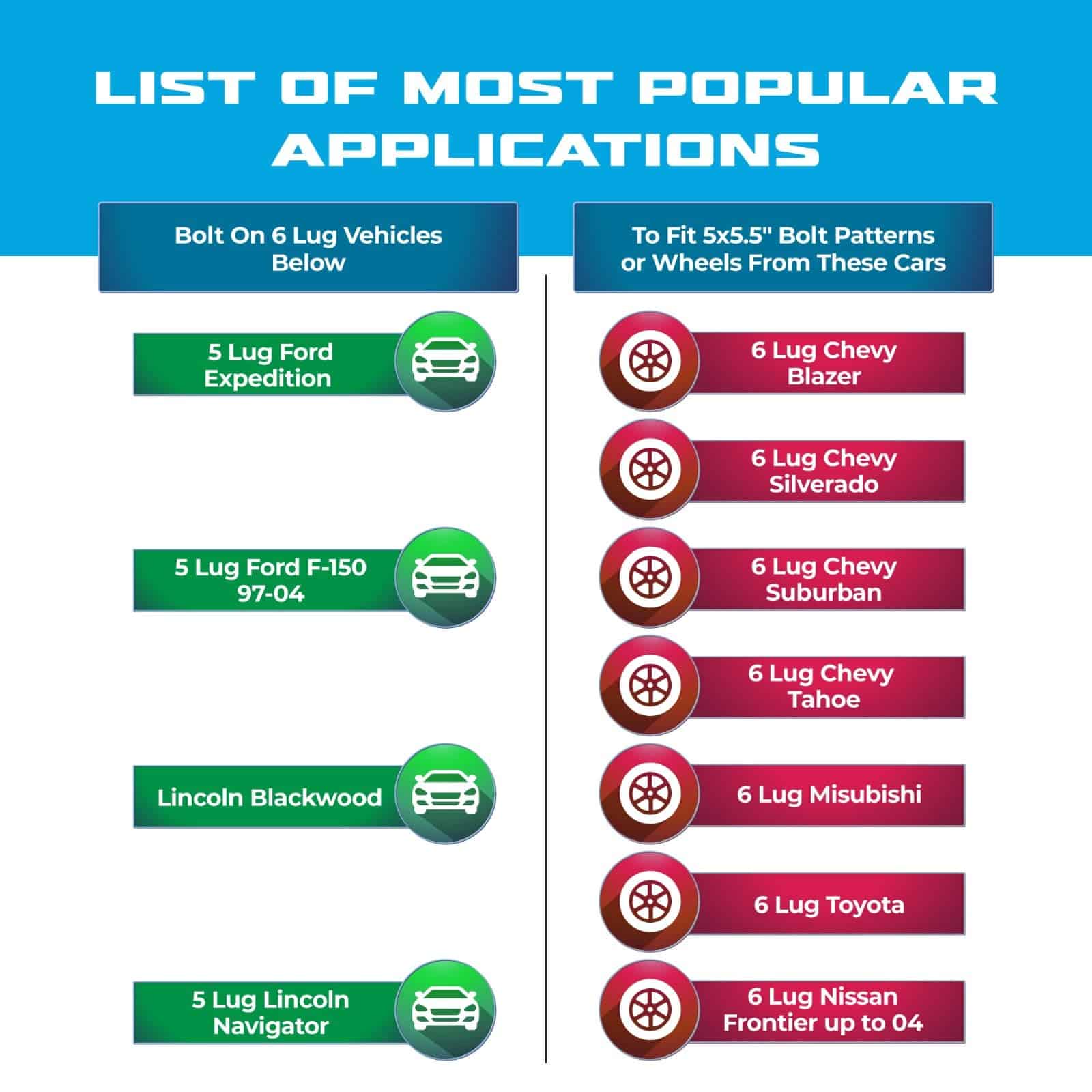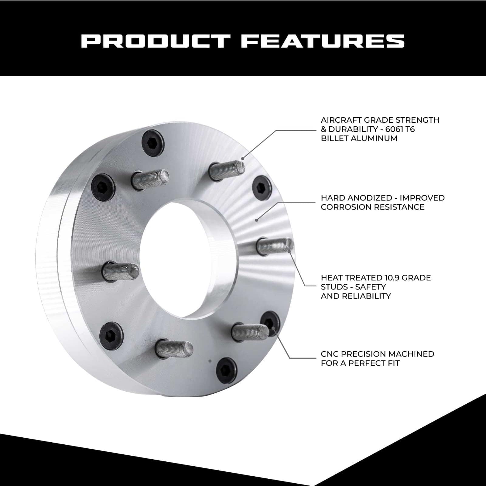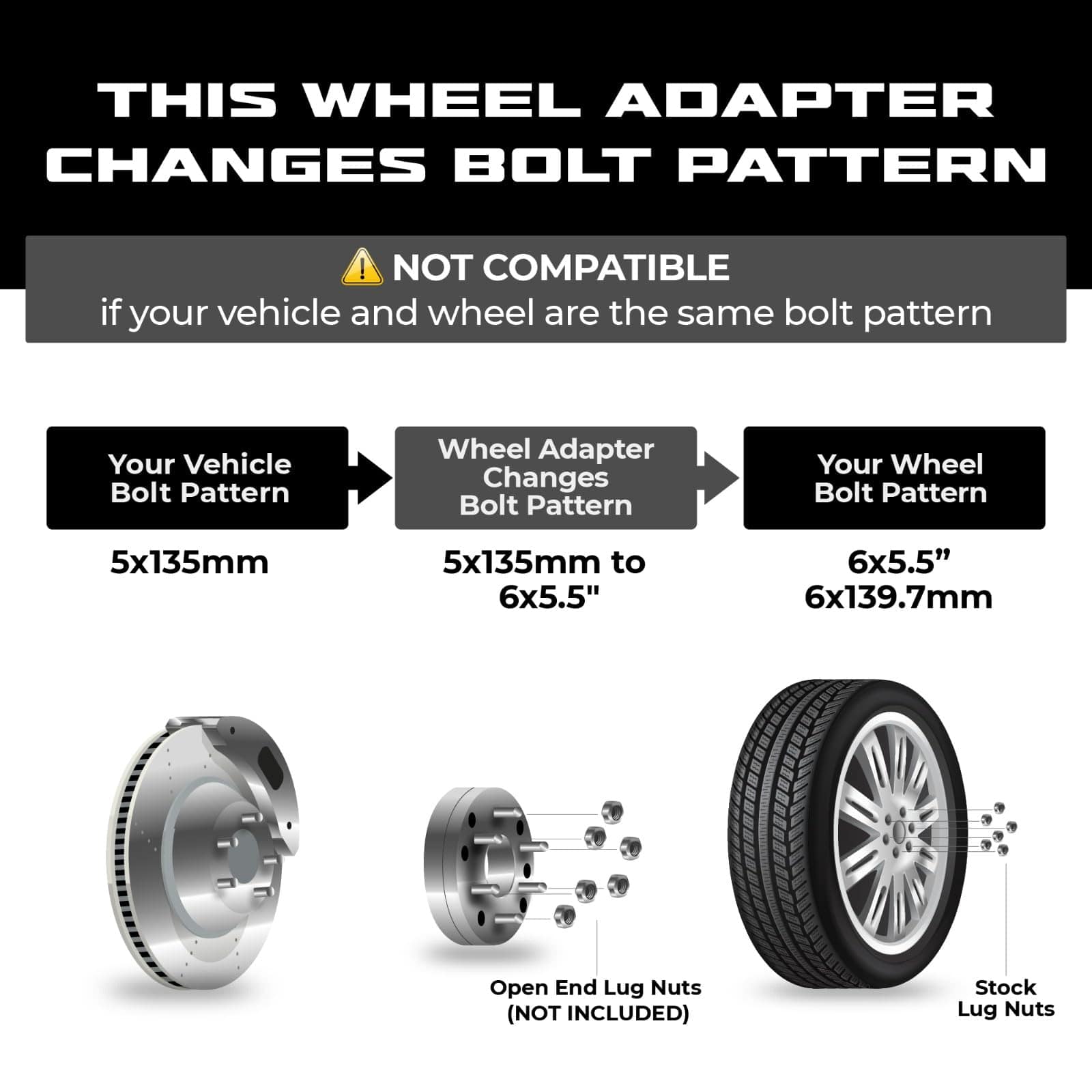 Información del Producto: Estos adaptadores de rueda tipo conversión de dos piezas se utilizan para convertir un vehículo de 5 pernos con patrón de perno de 135mm para que quepan ruedas con un patrón de perno de 6×5.5 (139.7mm). Mayormente utilizados para convertir el Lincoln Navigator de 5 pernos, etc para instalar las ruedas Chevy Tahoe de 6 pernos, etc. También aumentarán el espacio entre las ruedas en 2 pulgadas para ayudar a obtener la suficiente separación para neumáticos y llantas más anchos. Mecanizado CNC con artesanía de precisión utilizando forjado de calidad de aluminio 6061 T6 de calidad aeroespacial, con características de alta capacidad de carga y resistencia a la corrosión. Los pernos de alta calidad están preinstalados. Se venden como un par para 2 ruedas. Ordene 2 pares para las 4 ruedas. Especificaciones del Adaptador: Patrón de Perno de Vehículo: 5x135mm Patrón de Perno de Rueda: 6×5.5″ (139.7mm) Tamaño del Hilo de los Pernos: 14×1.5 Tamaño del Centro del Cubo: 88mm Grosor: 2 pulgadas (50mm) Torque de la Tuerca: 95 ft-lbs Torque del Perno Allen Negro: 55 ft-lbs Notas de Instalación: Desatornille y separe las dos piezas del adaptador primero. Instale la pieza interna del adaptador usando tuercas cortas de extremo abierto con un hexágono de no más de 13/16″. Si los pernos del cubo sobresalen fuera de la pieza interna del adaptador y evitan que la pieza externa del adaptador se asiente correctamente, es necesario acortar los pernos de fábrica. Adapte la pieza externa al adaptador interno utilizando los pernos Allen negros provistos. Instale sus ruedas en los pernos de la pieza externa del adaptador utilizando las tuercas adecuadas que coincidan tanto con el tamaño de hilo de los pernos del adaptador como el estilo de asiento de sus ruedas.