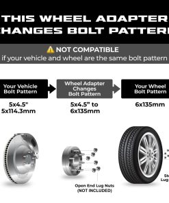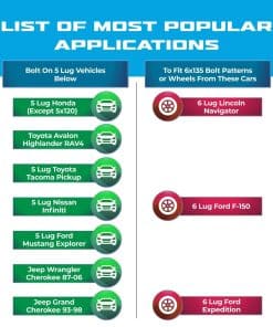 Estos adaptadores de rueda de tipo de conversión de dos piezas se utilizan para convertir un vehículo de 5 birlos con un patrón de perno de 4.5″ (114.3mm) para que ajuste a ruedas con un patrón de perno 6×135. Mayormente utilizados para Mustang Ford de 5 birlos, GT, etc. para instalar ruedas Ford Expedition de 6 birlos, etc. También espaciarán tus ruedas 2 pulgadas para ayudarte a obtener suficiente espacio para neumáticos y rines más anchos. Mecanizados CNC con artesanía de precisión utilizando forjado de calidad aeroespacial 6061 T6, presentados en alta capacidad de carga y resistencia a la corrosión. Los pernos de alta calidad están preinstalados. Se venden como par para 2 ruedas. Ordena 2 pares para las 4 ruedas.