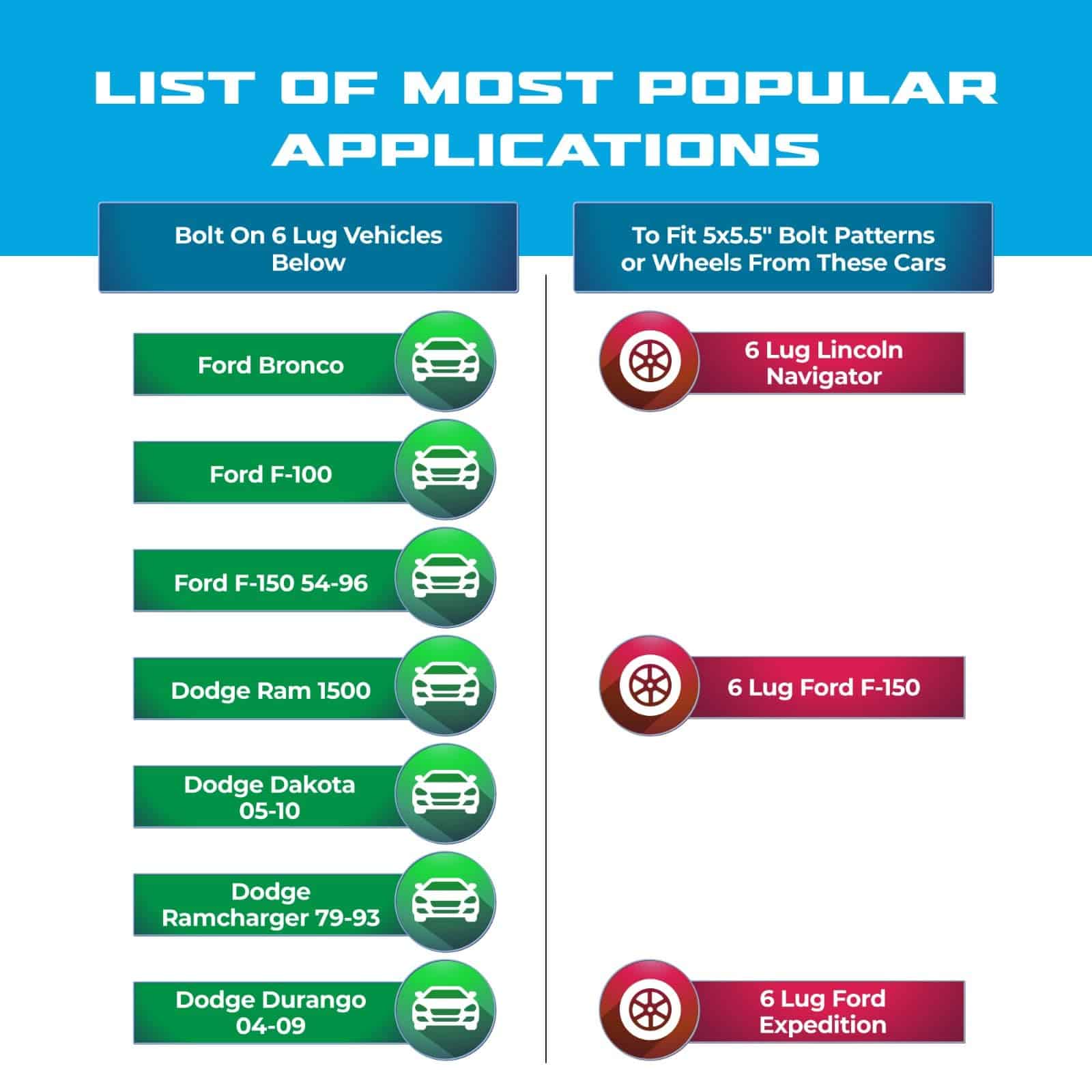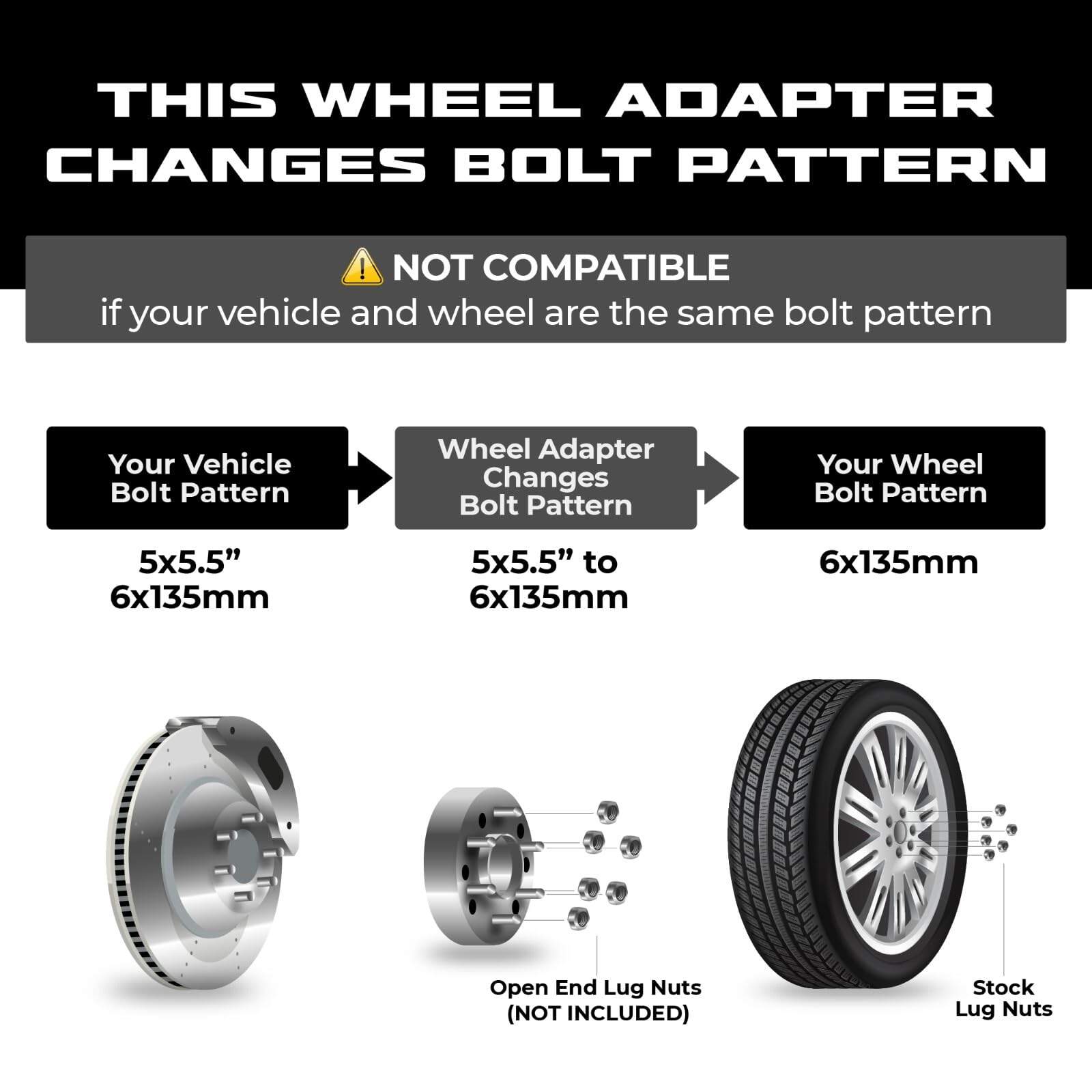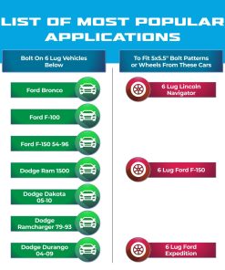 Este adaptador de rueda EZAccessory te permite convertir tu vehículo de un patrón de pernos de 5 a uno de 6, lo que te permite colocar ruedas de 6 pernos en un vehículo de 5 pernos. Es compatible con vehículos con un patrón de pernos de 5×5.5″ o 5×139.7mm. Los adaptadores están diseñados para convertir a una rueda con un patrón de pernos de 6x135mm. Fabricados en aluminio forjado 6061 T6 de calidad aeronáutica, cuentan con mecanizado CNC de precisión y anodizado para resistencia a la corrosión. Los pernos de acero de grado 10.9 tratados térmicamente garantizan una alta capacidad de carga y una conducción estable. ¡Obtén más estabilidad y una postura más ancha con estos adaptadores de rueda de calidad superior! (Se venden en un juego de 2 pares, que incluyen 4 adaptadores).