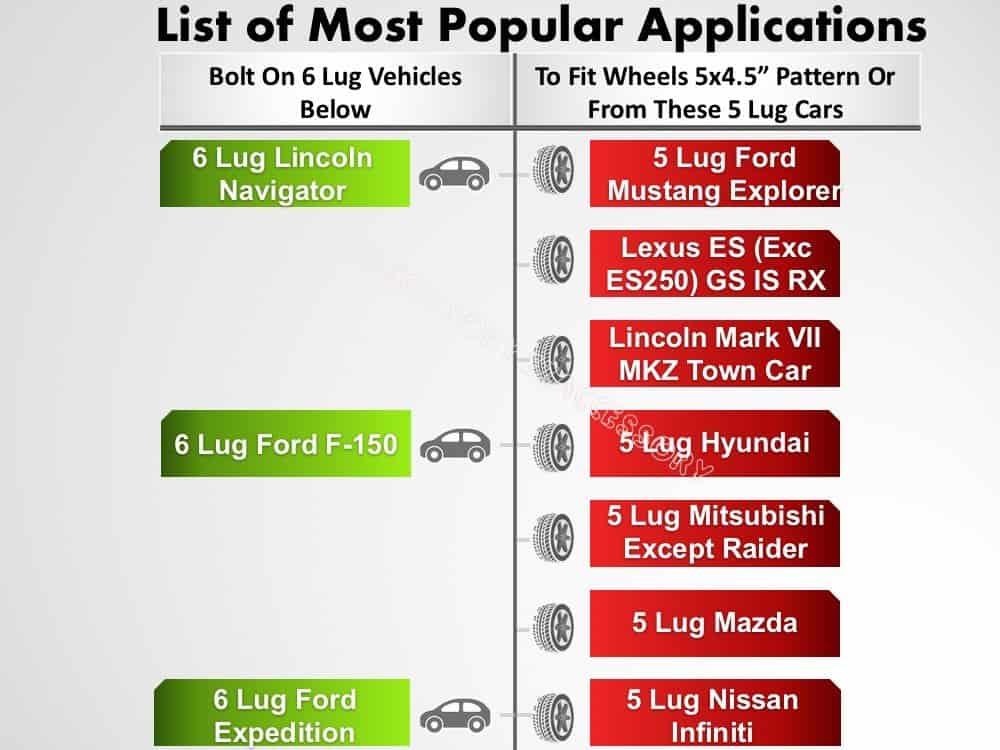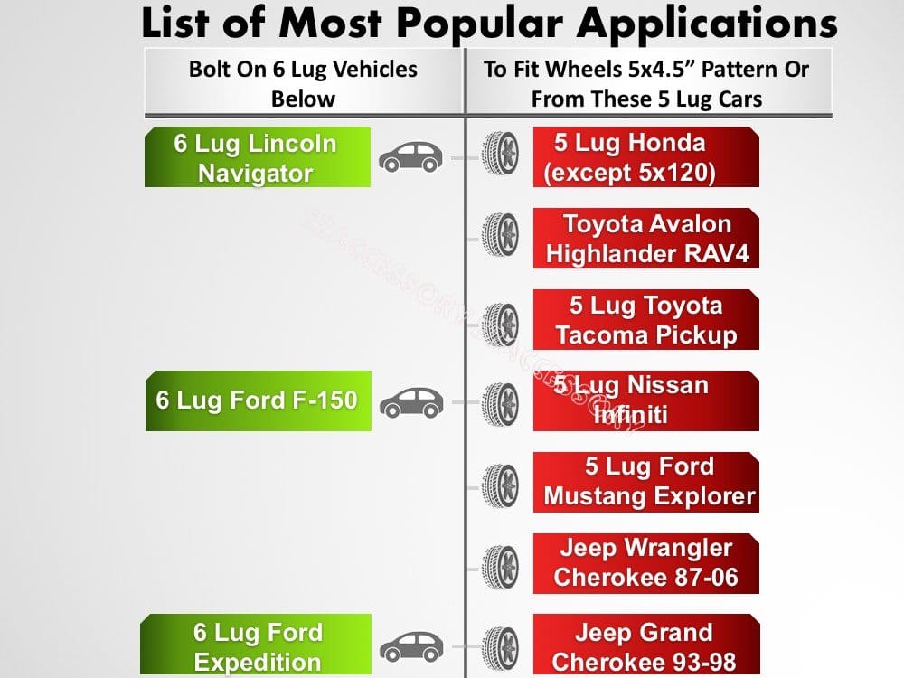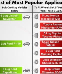 Estos adaptadores de ruedas de tipo de conversión de dos piezas se utilizan para convertir un vehículo de 6 birlos con patrón de pernos de 135mm para que se ajusten a rines con patrón de pernos de 5×4.5 (114.3mm). Principalmente utilizados para Lincoln Navigator de 6 birlos, Ford F150, Expedition, etc., para instalar rines de Ford Mustang de 5 birlos, etc. También espaciarán sus rines en 2 pulgadas para ayudar a obtener suficiente espacio para neumáticos y rines más anchos. Mecanizados CNC con artesanía de precisión utilizando billet de calidad aeroespacial 6061 T6, destacados por capacidad de carga alta y resistencia a la corrosión. Los pernos de alta calidad están preinstalados. Se venden en par para 2 ruedas. Ordene 2 pares para las 4 ruedas.