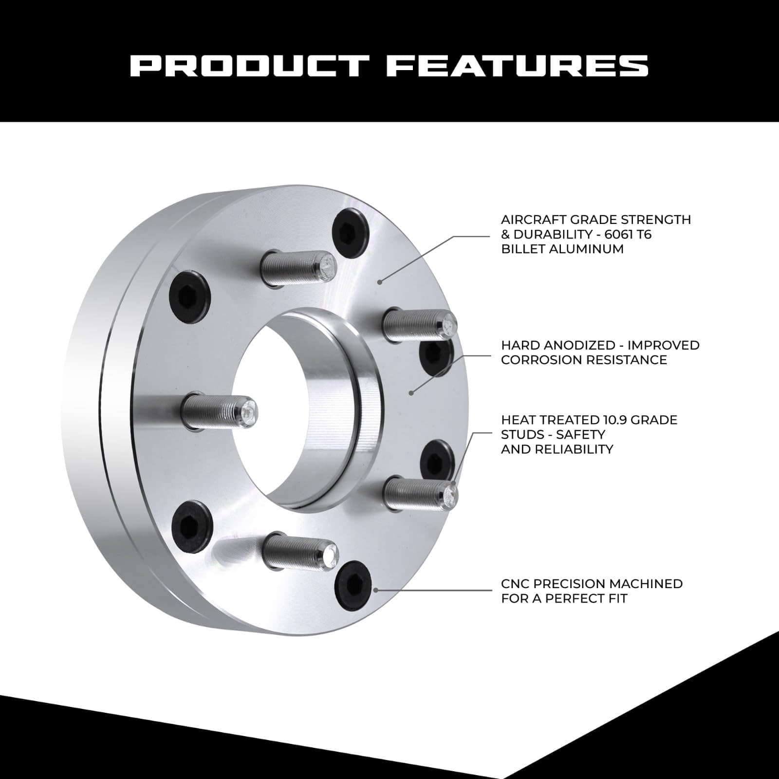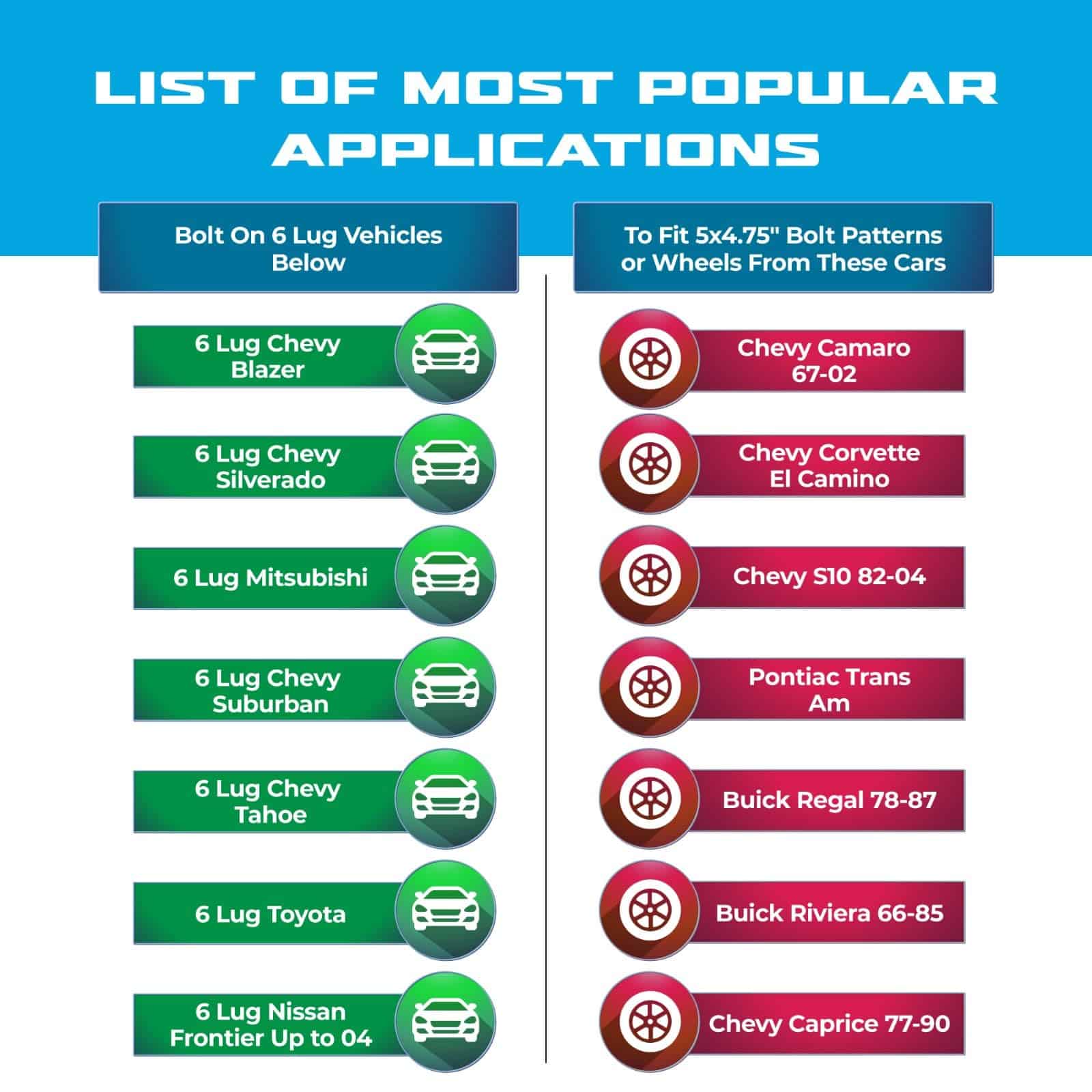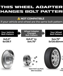 Estos adaptadores de rueda tipo conversión de dos piezas se utilizan para convertir un vehículo de 6 pernos con patrón de 5.5″ (139.7 mm) a ruedas con patrón de 5×4.75 (120.65 mm). Se utilizan principalmente en Chevy Tahoe de 6 pernos, etc., para instalar ruedas de Chevy Corvette de 5 pernos, etc. También espaciarán sus ruedas en 2 pulgadas para ayudarle a obtener suficiente espacio para neumáticos y llantas más anchas. Mecanizado CNC con artesanía de precisión utilizando aluminio de calidad aeroespacial 6061 T6, caracterizado por alta capacidad de carga y resistencia a la corrosión. Los pernos de alta calidad vienen preinstalados. Se venden como par para 2 ruedas. Ordene 2 pares para las 4 ruedas.