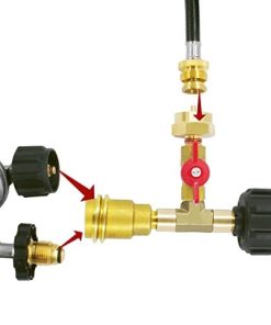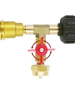 Adaptador de T de Latón de Gas Propano con 3 Puertos para Camping o RV, Tuerca Acme y Conector de Gas Propano QCC1 con Adaptador de Rosca de Cilindro Desechable Hembra/Macho de 1″-20. El adaptador de T de gas propano puede distribuir el gas propano de un tanque a dos aparatos de gas propano. Simplemente conecte el separador de gas propano en el tanque de propano para hacer funcionar dos aparatos de gas propano en un solo tanque de propano. El adaptador de tuerca de gas propano macho QCC1 tiene características de seguridad incorporadas, la estructura tiene conexiones QCC1/Tipo1 macho y hembra POL, y puede convertir y conectar dos tipos de reguladores de manguera de propano. El otro extremo de la salida del separador de gas propano está equipado con una válvula de cierre y un adaptador de rosca de cilindro desechable hembra de 1″x20, adecuado para la recarga de tanques de propano de 1 libra y el ensamblaje de manguera de extensión de antorcha de propano giratoria hembra de 1″x20 de cilindro desechable. El accesorio en forma de T se utiliza para conectar reguladores a tanques y manguera, ideal para usar en parrillas de gas, calentadores, ahumadores, estufas de campamento, linternas, parrilla de mesa, mesa de pozo de fuego, freidora de pavo y más aparatos de gas propano.