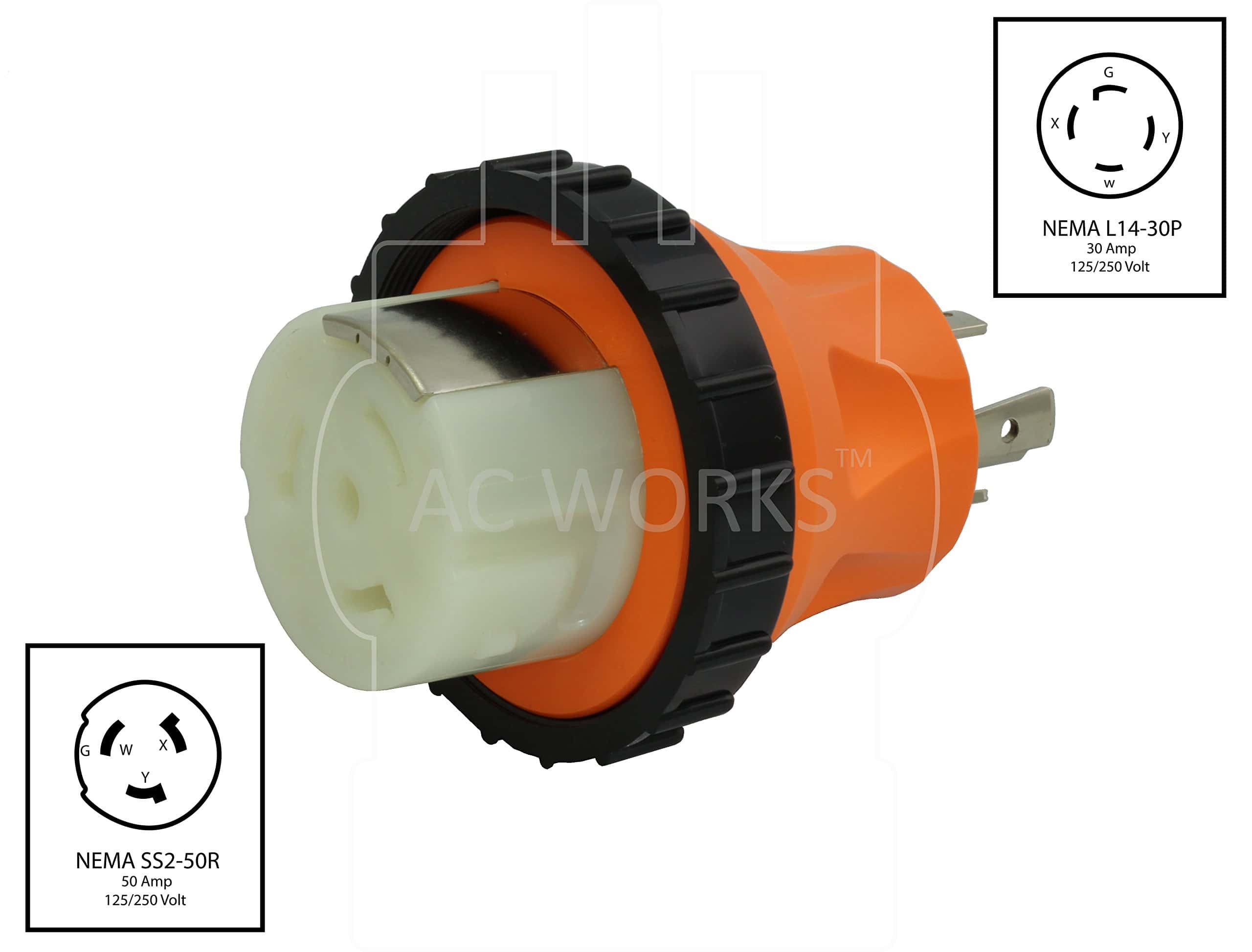 Adaptador de Generador para RV y Marina, Enchufe de Bloqueo de 4 Puntas L14-30P de 30 amperios a Adaptador para RV y Marina de 50 amperios. Adaptador de Energía para RV y Marina, Enchufe de Bloqueo de 4 Puntas L14-30P a Conector de 50A 125/250V, NEMA L14-30P a NEMA SS2-50R para RV y Marina.