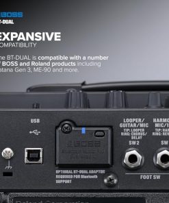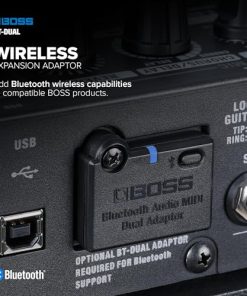 Adaptador de Expansión Inalámbrico El Adaptador Dual Bluetooth Audio MIDI (BT-DUAL) es un adaptador compacto que aporta capacidades de audio y MIDI Bluetooth a productos compatibles de BOSS. Una vez instalado, puedes emparejarlo con un dispositivo Bluetooth como un smartphone o tablet y comunicarte de forma inalámbrica con el producto. La funcionalidad inalámbrica real que está disponible depende del modelo específico del producto, pero puede incluir la transmisión de música con audio Bluetooth, el control de varias funciones del producto con MIDI Bluetooth y más.
