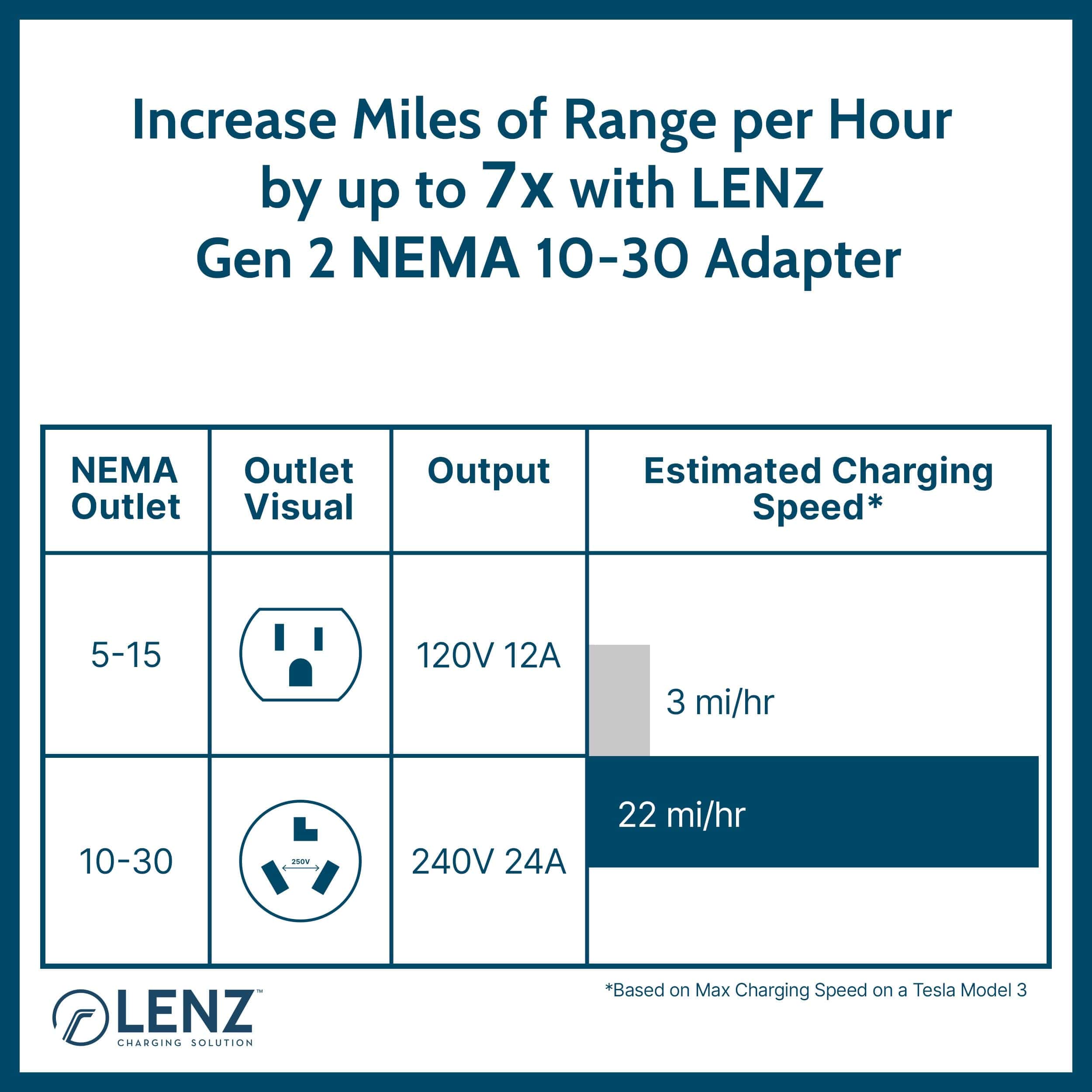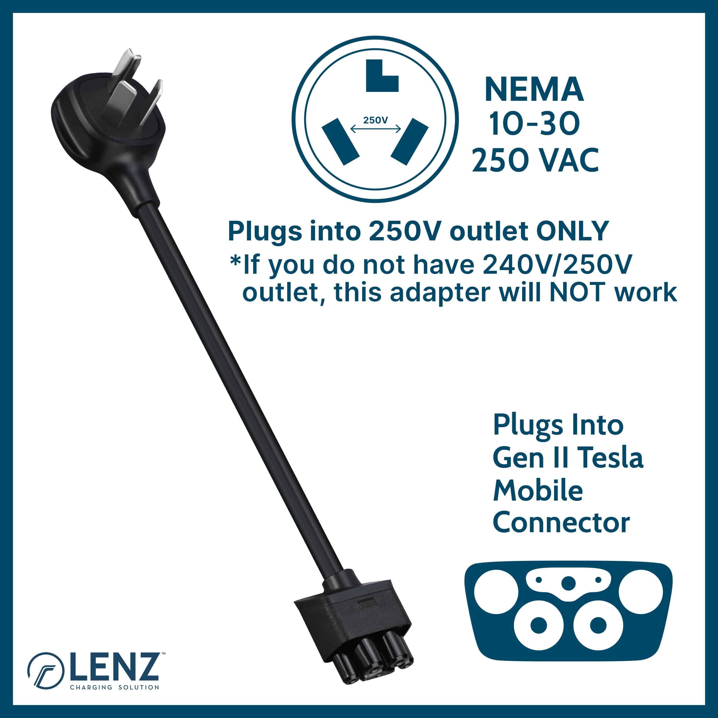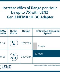LENZ es líder en la fabricación de accesorios automotrices premium para Vehículos Eléctricos (EV). Aplicando los materiales de más alta calidad a diseños prácticos, los productos LENZ están diseñados para cumplir con las necesidades específicas de los vehículos EV y sus propietarios. Los productos de carga EV y accesorios de LENZ están respaldados por nuestra garantía líder en la industria con soporte basado en EE. UU. El Adaptador NEMA 10-30 de LENZ es compatible con el Cargador Portátil Tesla Gen 2 (NO compatible con el Cargador Portátil Gen 1) para que puedas cargar tu Tesla conectándolo a una Salida NEMA 10-30 de 240V a 32 Amperios.