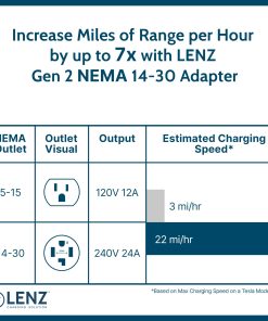 LENZ es líder en la fabricación de accesorios premium para vehículos eléctricos (EV) automotrices. Aplicando los materiales de más alta calidad a diseños prácticos, los productos LENZ están diseñados para satisfacer las necesidades específicas de los vehículos EV y sus propietarios. Los productos y accesorios de carga de EV LENZ están respaldados por nuestra garantía líder en la industria con soporte en EE. UU. Actualiza tu carga de Nivel 1 a carga de Nivel 2 al reemplazar el adaptador estándar NEMA 5-15 en tu Cargador Móvil Tesla Gen 2 con el Adaptador LENZ Gen 2 NEMA 14-30 para carga de 240V a 32 Amperios. Si tienes un receptáculo de 14-30 en tu casa, trabajo o donde sea que estés visitando, aumenta tus millas de rango por hora de carga hasta 7 veces (dependiendo de tu modelo de Tesla). Aumenta tu rango más rápido y de manera segura con el Adaptador LENZ Gen 2 NEMA 14-30. Características clave y beneficios: – Longitud de 10 pulgadas (de extremo a extremo) – Clasificado a 40 Amperios (límite de 32 Amperios con el Cargador Móvil Tesla) – Compatible con todos los modelos de Tesla – Enchufar y jugar con el Cargador Móvil Tesla Gen 2 – Materiales de alta calidad – Niquelado para resistencia a la intemperie – Garantía de 12 meses – Listado ETL (Control No. 5026085) – Cumple con UL STD. 817 – Certificado para CSA STD. C22.2 21 CARACTERÍSTICA DE SEGURIDAD: Sensor térmico integrado para comunicarse con el sistema a bordo de Tesla para reducir la fuerza de carga o desactivarse temporalmente a una temperatura máxima de operación de 122 F (50 C).