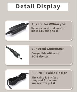 1. Bajo Ruido: Esta fuente de alimentación de 9v es silenciosa, sin zumbidos ni ruido cíclico. Por ejemplo, cuando conectas tu Strat a un amplificador de tubos Blues Deluxe, todo lo que escucharás será el dulce sonido de tonos blues sin ningún ruido que se produce con las fuentes de alimentación genéricas. La pieza justo detrás del conector de barril alberga dos bobinas que funcionan como filtros de RF. 2. Compatibilidad: Esto funcionará con cualquier dispositivo BOSS de 9 voltios de CC que consuma hasta (pero no exceda) 1.0 amperios. Para asegurarte de que sea adecuado para un dispositivo que no sea de Boss, revisa tu receptáculo de conector. El conector de barril macho en este adaptador es de 2.1 mm x 5.5 mm, centro negativo. Esta fuente de alimentación para pedales funciona para varios tipos de pedales. Se adapta a Boss RE-20, ME-80, RC-300, GT1, Boss Katana mini, CS3 y TU3W, Boss RC-3, ME50-B, ME-70, RC-1, DD-3, ME 25, BR-80, GT1B, RC-30, Roland, etc. 3. Pequeño y Confiable: El adaptador es de auto voltaje de fuentes de 100-240v, lo que lo hace ideal para viajar y el nuevo cargador de pared rediseñado ahora solo ocupa un espacio en la regleta de enchufes. 4. Ahorra Pilas: Cuando estés cansado de gastar pilas, este adaptador de 9v será una buena elección, se conecta y alimenta el amplificador de manera excelente sin necesidad de pilas. 5. Lo que Recibes: Fuente de alimentación de 9v VHBW para pedales de guitarra, guía de bienvenida, garantía de 18 meses y servicio al cliente amigable.