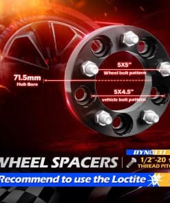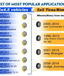 Importante: estos adaptadores de rueda de conversión solo se utilizan para Ruedas de 5×5 (5x127mm) en un Vehículo de 5×4.5 (5×114.3mm)EL Patrón de Tornillo del Vehículo Debe Ser: 5×4.5 o 5×114.3EL Patrón de Tornillo de la Rueda Debe Ser: 5×5 o 5x127Grosor: 1.25 (32 mm)Cambiar Patrón de Tornillos: 5×4.5 (114.3mm) a 5×5» (5x127mm)Rosca: 1/2 -20 Diámetro del Cubo: 71.5 mmCompatibilidad de Ruedas y VehículosRuedas(Llantas) de los siguientes modelos:2005-2010 J-e-ep Commander XK1999-2010 Grand Cherokee WJ WK2007-2019 Wrangler JK2008-2019 Dodge JourneyVehículos de los siguientes modelos:1987-1990 Dodge Dakota 1983-2012 Fo-rd Ranger 1992-2011 Fo-rd Crown Victoria 2006-2014 Fo-rd Edge 1990-2018 Fo-rd Explorer 2001-2010 Fo-rd Explorer Sport Trac 2005-2007 Fo-rd Five Hundred 2008-2018 Fo-rd Flex 2004-2007 Fo-rd Freestar 1994-2014 Fo-rd Mustang 1985-1997 Fo-rd Aerostar1983-1990 Fo-rd Bronco II2005-2017 Fo-rd Falcon2008-2018 Fo-rd Taurus2004-2017 Fo-rd Territory1984-2013 J-e-ep Cherokee XJ KJ KK 1992-1998 J-e-ep Grand Cherokee ZJ 2002-2013 J-e-ep Liberty KJ KK1987-2006 J-e-ep Wrangler TJ YJ1982-2011 Lincoln Town Car 1997-2010 Mercury MountaineerPor favor, Verifique la Compatibilidad anterior antes de Realizar su Pedido