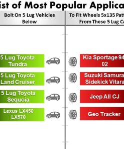 El juego de adaptadores de rueda se utiliza en concentradores con patrón de perno de 5×150 para que se ajusten a las ruedas con patrón de perno de 5×5.5 (139.7mm) (por ejemplo, ruedas de 5 patrones de Dodge RAM 1500). Separarán tus ruedas en 1 pulgada para ayudarte a obtener suficiente espacio para neumáticos y llantas más anchos. Mecanizado CNC con artesanía de precisión utilizando billet de calidad aeroespacial 6061 T6, con alta capacidad de carga y resistencia a la corrosión. Los tornillos de alta calidad vienen preinstalados y se incluyen tuercas de montaje abiertas de tamaño 14×1.5. Se venden como par para 2 ruedas. Ordena 2 pares para las 4 ruedas.