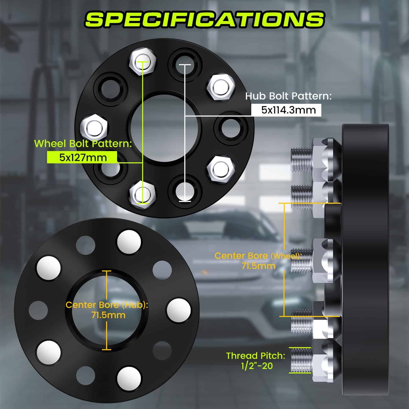 El Adaptador Customadeonly cuenta con un diámetro interno de 70.3mm. Además, con un diámetro externo de borde de 71.5mm (El diámetro del buje de la rueda debe ser 71.5mm o mayor), se pueden utilizar anillos de buje cuando el tamaño del agujero de la rueda excede los 71.5mm para una integración perfecta. Los espaciadores de rueda Customadeonly están fabricados mediante el proceso CNC automático en nuestro centro de mecanizado de 4 ejes. Ofreciendo calidad y precisión consistentes en cada producto producido, eliminando el problema de equilibrio que otras marcas pueden tener. Fabricados con aluminio de alta calidad 6061 T-6, el material es conocido por su resistencia a la tracción y durabilidad. Los espaciadores están ensamblados con pernos de acero carbono clase 10.9 (grado 8 SAE) tratados térmicamente. Los espaciadores de rueda Customadeonly también cuentan con nuestra garantía de reemplazo de producto de 2 años contra cualquier defecto funcional. Si tiene alguna pregunta sobre nuestro producto, no dude en contactarnos, estamos aquí para ayudar.