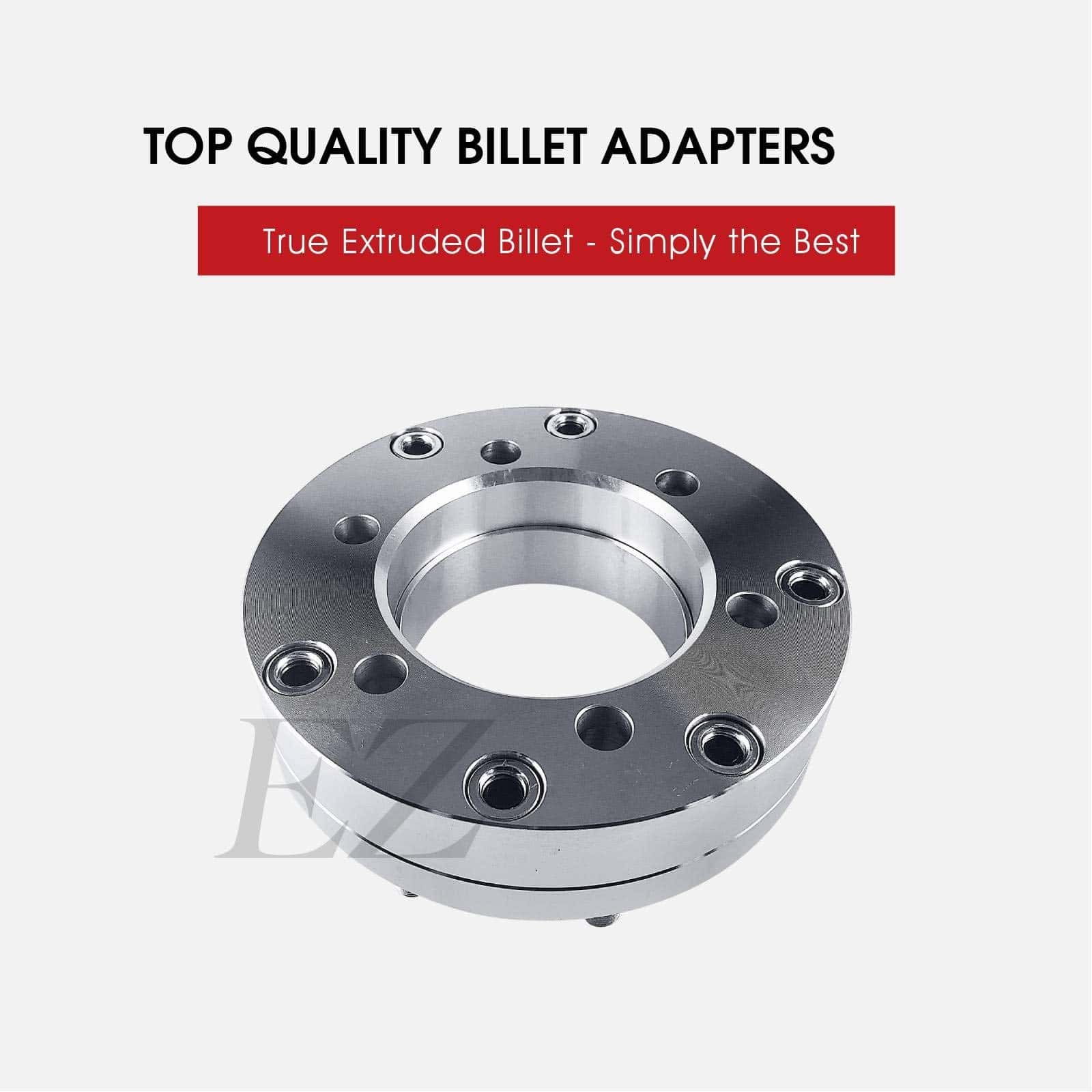 Información del Producto: Estos adaptadores de rueda de tipo conversión de dos piezas se utilizan para convertir un patrón de pernos de cubo de 6 pernos y 5.5 pulgadas (139.7mm) para que se ajusten a ruedas de 8 pernos con un patrón de pernos de 170mm. Los adaptadores están construidos con un labio centrado en el centro de 125mm para soportar las ruedas F250 o F350 Super Duty para un ajuste de fábrica. Espaciarán tus ruedas en 2 pulgadas. Verifica que tengas suficiente espacio libre. Mecanizados CNC con artesanía de precisión utilizando forjados de aluminio de calidad aeroespacial 6061 T6, con una alta capacidad de carga y resistencia a la corrosión. Los pernos de alta calidad están preinstalados. Se venden como un par para 2 ruedas. Ordene 2 pares para las 4 ruedas. nDiseño centrado en el centro del cubo para un ajuste perfecto tanto en los vehículos como en las ruedas de fábrica enumeradas a continuación. Reduce significativamente el estrés en los rodamientos y la posibilidad de vibraciones. nAjuste Perfecto en el Cubo de Patrón de 6×5.5 pulgadas o en los siguientes Vehículos: nChevy / GMC: Todos los Blazer de 6 pernos, Silverado, Suburban, Tahoe nToyota: Todos los de 6 pernos nNissan: Frontier, Xterra (hasta 04), Pickup nMitsubishi: de 6 pernos nAjuste Centrado en el Cubo para Ruedas de Fábrica (o ruedas con Orificio de 125mm): Compatible con Estos Vehículos: nFord: Super Duty F250 (03-en adelante), F350 (03-en adelante) nPara Ford Super Duty F250 F350 (99-02) – contáctanos antes de comprar; se requieren cambios en las tuercas de los pernos nEspecificaciones del Adaptador: nPatrón de Pernos del Vehículo: 6×5.5 pulgadas (139.7mm) nPatrón de Pernos de la Rueda: 8x170mm nTamaño del Roscado de los Pernos: 14×1.5 nTamaño del Orificio del Cubo: 108mm nLabio Centrado en el Centro: 125mm nGrosor: 2 pulgadas (50mm) nTorque de las Tuercas: 95 ft-lbs nTorque de los Pernos Allen Negros: 55 ft-lbs nNotas Técnicas: nSi los pernos del cubo sobresalen fuera de la pieza adaptadora interna y evitan que la pieza adaptadora exterior se asiente correctamente, es necesario acortar los pernos de fábrica.