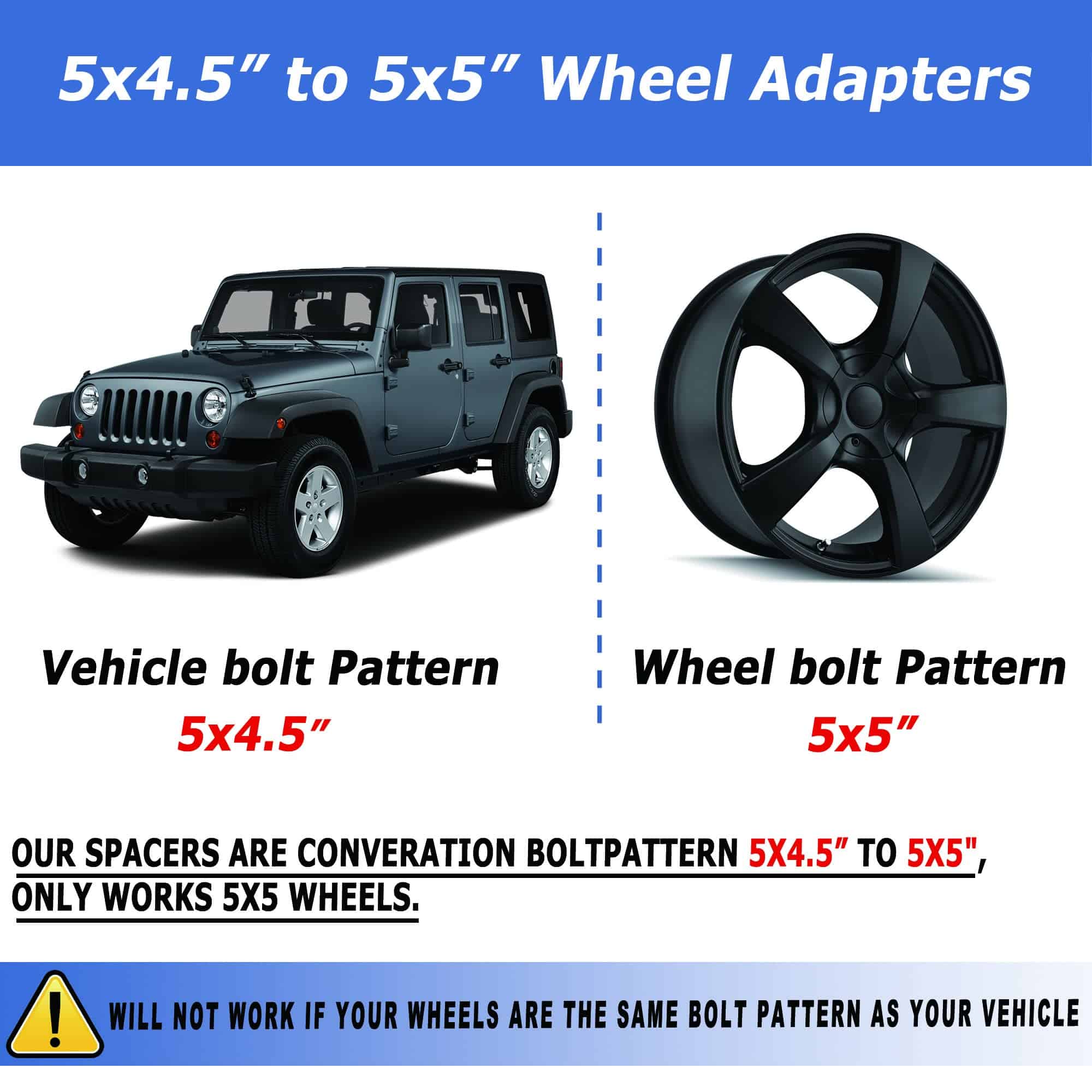 Este adaptador es un Adaptador de Conversión, solo se ajusta al cambiar sus ruedas de fábrica de 5×4.5 a ruedas de 5×5 de postventa