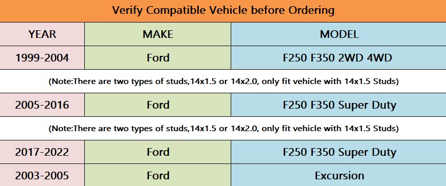 Especificación: Patrón de pernos del vehículo 8x170mm, patrón de pernos de rueda 8×6.5(8×165.1)mm PCD, Rosca SAE M14x1.5, Buje de 125mm, 4pcs 1.5″ de grosor. Los Adaptadores de Rueda RSOXTECH ampliarán la base de ruedas de su automóvil, mejorando el agarre, la maniobrabilidad y la precisión. Desarrollados en una aleación especial de aluminio a través de una tecnología de forja innovadora, después se forjan con máquina CNC para obtener la superficie coplanar perfecta. Están tratados térmicamente para aumentar la resistencia mecánica y luego se anodizan para obtener protección contra la oxidación. ASEGÚRESE POR FAVOR: 1. Patrón de pernos de los espaciadores 8×170 de su vehículo 2. Patrón de pernos de los pernos de los espaciadores 8X6.5(8×165.1)mm de su nueva rueda 3. Paso de rosca M14x1.5 de los espaciadores de su vehículo 4. Longitud de rosca de los espaciadores 47 0.3 mm de su vehículo 5. Buje de los espaciadores 126.15mm de su vehículo Compatible con F-2-5-0 y Super Duty 1999-2021 (solo se ajusta a pernos de 14×1.5) Compatible con F350 y Super Duty 1999-2021 (solo se ajusta a pernos de 14×1.5) Compatible con Excursión 2003-2005 NOTAS IMPORTANTES: Se recomienda la instalación profesional. Es necesario un alineamiento después de la instalación para prevenir cualquier oscilación y vibración. Evite el uso de una llave de impacto; el uso inadecuado puede hacer que los pernos se rompan o aflojen mientras conduce, lo que podría causar un accidente o lesión. Asegúrese de dar 6-8 vueltas antes de apretar. Vuelva a apretar todos los pernos después de 25-50 millas de conducción, luego nuevamente después de 1-2,000 millas. La parte trasera del adaptador debe estar pegada al buje del vehículo. No debe haber óxido en el interior del buje mientras se instalan los espaciadores de rueda centrados en el buje. Si los pernos sobrepasan la cara del adaptador, deberá cortarlos o limarlos más cortos.