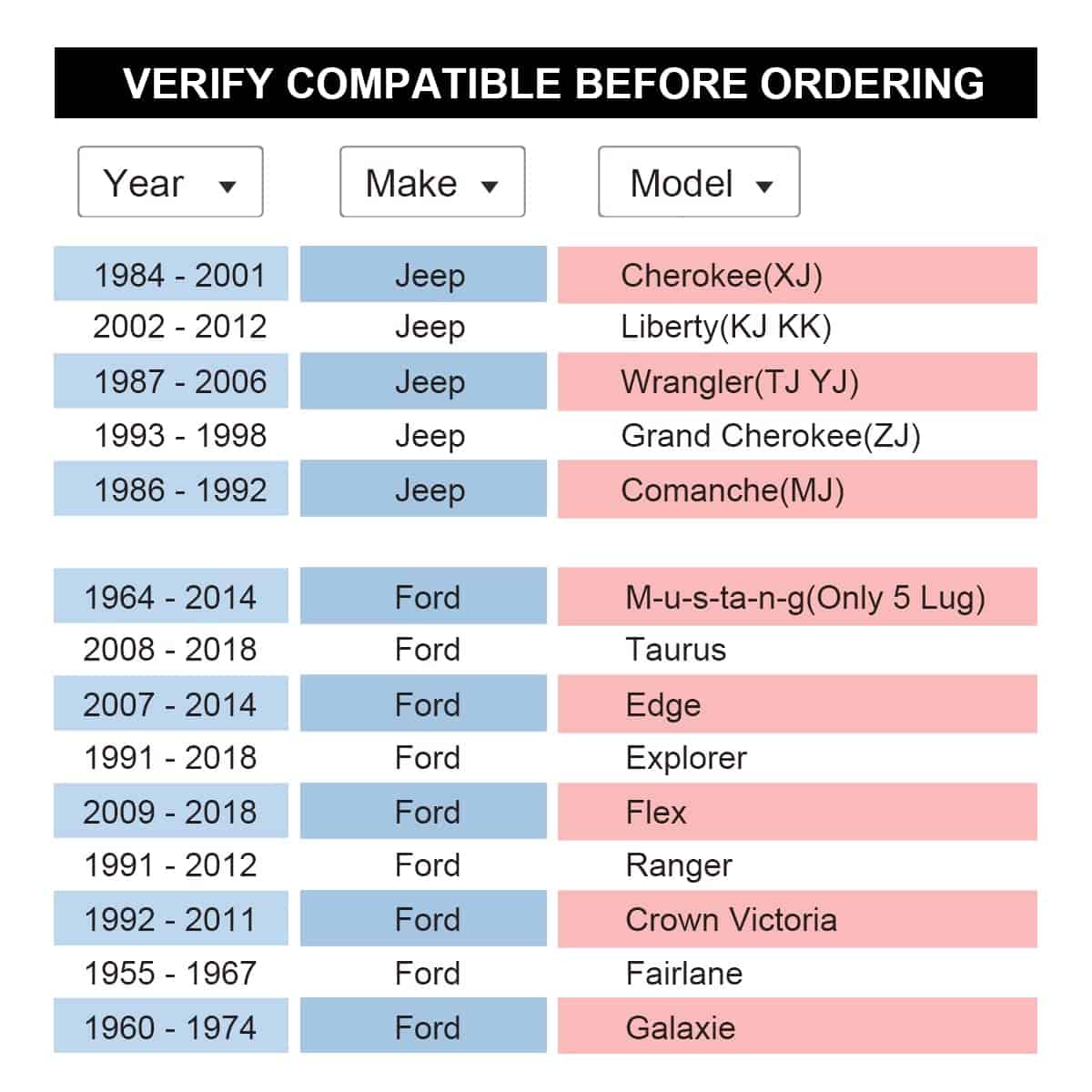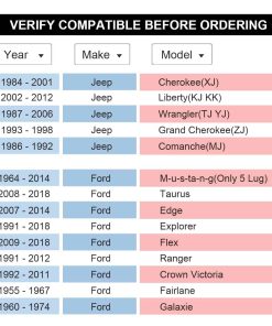 Si no estás seguro de si este artículo es compatible contigo, envíanos un mensaje con el año, marca y modelo de tu vehículo y te ayudaremos a encontrar el artículo que necesitas. Compatible con vehículos como Cherokee, Liberty, Wrangler, Grand Cherokee, Comanche, Mustang, Taurus, Edge, Explorer, Flex, Ranger, MKS, Town Car, MKT, MKX, Grand Marquis, Cougar, Mountaineer. Verifica que el número de pernos, el diámetro del círuclo de pernos, el diámetro del centro y el tamaño de los pernos coincidan con tu vehículo antes de realizar la compra. Se recomienda la instalación por un profesional capacitado, aunque no es necesario. No recomendamos instalar las tuercas de los pernos con herramientas eléctricas, es mejor hacerlo manualmente.