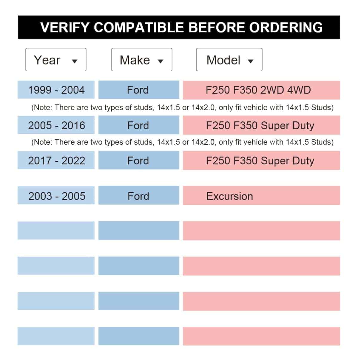 Si no está seguro de si este artículo se ajusta a su vehículo, envíenos un mensaje con el año, fabricante y modelo de su vehículo y encontraremos el artículo que necesita. Compatible con Ford Excursion 2003-2005, Ford F250 2WD 4WD 1999-2004 (Solo para vehículos con pernos de M14x1.5, por favor revise los pernos de su vehículo), Ford F250 Super Duty 2WD 4WD 2005-2016 (Solo para vehículos con pernos de M14x1.5, por favor revise los pernos de su vehículo), Ford F250 Super Duty 2WD 4WD 2017-2022, Ford F350 2WD 4WD 1999-2004 (Solo para vehículos con pernos de M14x1.5, por favor revise los pernos de su vehículo), Ford F350 Super Duty 2WD 4WD 2005-2016 (Solo para vehículos con pernos de M14x1.5, por favor revise los pernos de su vehículo), Ford F350 Super Duty 2WD 4WD 2017-2022. NO SE AJUSTA A F350 DOBLE RUEDA. Recomendamos verificar que el conteo de pernos, el diámetro del círculo de pernos, el centro del cubo y el tamaño del perno coincidan con su vehículo antes de realizar el pedido. Recomendamos que un profesional capacitado instale este kit, pero no es necesario. No recomendamos instalar las tuercas de perno con una herramienta eléctrica, es mejor hacerlo manualmente.