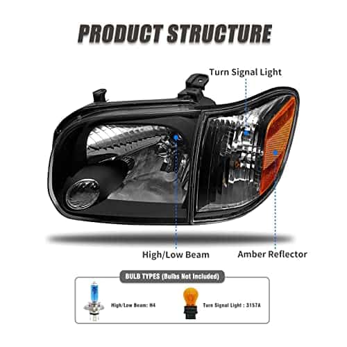 ¡Es hora de cambiar el conjunto de faros! ¿Por qué gastar tanto dinero en el taller de mantenimiento de autos? Solo necesita un par de faros nuevos y su auto lucirá nuevo nuevamente.DISEÑADO Compatible con Toyota Tundra Base / SR5 / Limited de 2005-2006 de 4 puertas (compatible solo con modelos de cabina doble) Toyota Sequoia SR5 / Limited de 2005-2007 solo Número de pieza equivalente al OEM: 81150-0C031/81110-0C031 Partslink: TO2502158/TO2503158 Condición: Nuevo Color: NEGRO CON REFLECTOR ÁMBAR Paquete Incluido: Lado del Conductor y del Pasajero Certificaciones: DOT, SAE Atención ¡Este producto no incluye bombillas Modelo de bombilla: Baja/Alta Tipo de bombilla: H4 Luz de Marcador Lateral: W5W