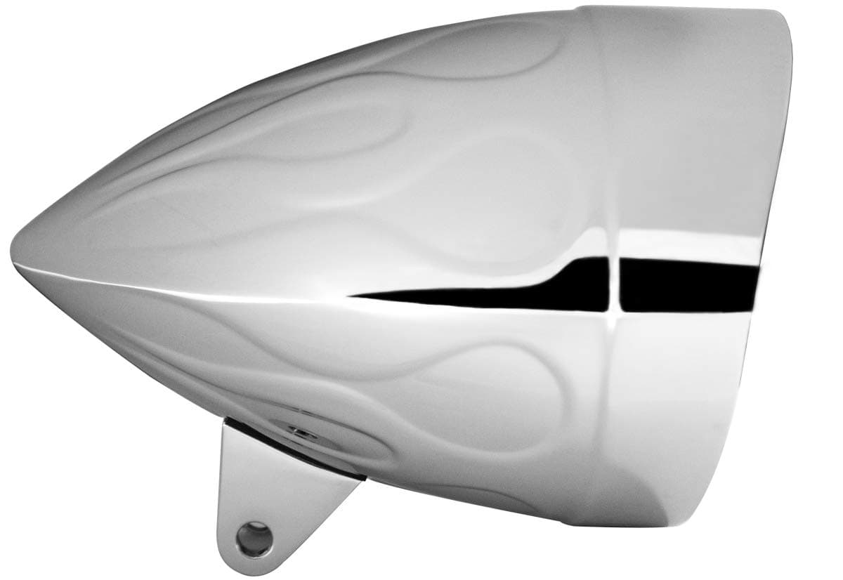 Cubo de faro redondo universal de la serie Rodeo Drive con visera levantada de llamas cromadas de 5 3/4″ con faro de corte de tarta de punto negro (HB54111-74) by Adjure. 1 Pieza. Carcasa cromada, lente clara. Bombilla: incluida.