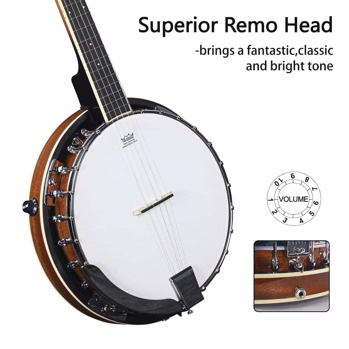 ADM Banjo 5 String Full Size Acoustic Electric Banjoes Set Remo Drum, Geared 5th Pegs Beginner Banjo Kit w/EQ Resonador Abierto o Cerrado, Paquete de Inicio Accesorios Clases en Línea para Adulto, Marrón. Versátil para conectar a un amplificador para controlar el volumen a tu gusto mientras mantienes su tono acústico para practicar. Perfecto para intermedios o jugadores experimentados para fiestas y actuaciones en el escenario, asegura la libertad de moverse en el escenario con un control de volumen más fácil sin retroalimentación. Black walnut fingerboard y bridge, sólidos y estables, hacen que el sonido sea más capasdo. Los lados y la parte posterior de la sapele tienen un hermoso grano de madera, son duros y no propensos a deformarse ni corroerse, por lo que el banjo es duradero. Nuestro paquete incluye estuche, afinador digital (batería no incluida), correa, cuerdas, púas, colgador y paño de limpieza. Puedes obtener estos accesorios que se adaptan a principiantes de una sola vez a un precio rentable. Al mismo tiempo, también disfrutarás de una lección adicional de un mes al contactarnos cuando el artículo llegue. Quality Remo top frosted head es nítido y brillante con un buen golpe; Asegurando claridad de sonido. Piezo oculto debajo del cabezal, captura la música clara y suave que es calmante para los oídos. Una bolsa más gruesa protegerá mejor el banjo, siendo una gran idea para llevarlo de viaje, acampar, hacer senderismo, ir a la playa. Y también perfecto para cualquier persona que siempre haya querido aprender a tocar este icónico instrumento