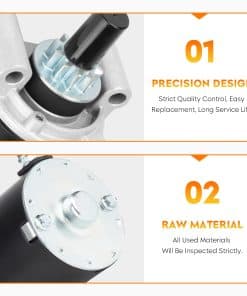 Especificaciones: Descripción: Arrancador Voltaje: 12 Rotación: CCW Dientes: 10 Reemplaza los números de parte: para Barsanco: 690-029 para J & N: 410-21067, 410-21082 para Cargo: 113017 para Dixie: MS-6001 para Dixie New: 206-07120 para John Deere: AM130407, AM130724, AM132818, SE501845 para Kohler: 25-098-05, 25-098-05-S, 25-098-06, 25-098-06-S para United Tech: 6560020-M030SM, 6727040-M030SM para Wilson: 91-09-1067 Compatible con: para Tractores JOHN DEERE – Cortacésped LT150 Todos Kohler 15HP para Tractores JOHN DEERE – Cortacésped LT160 Todos Kohler 16HP para Tractores JOHN DEERE – Cortacésped Sabre 1948GV Todos Kohler 19.9HP para Tractores JOHN DEERE – Cortacésped Sabre 1948HV Todos Kohler 19.9HP para Tractores JOHN DEERE – Cortacésped Sabre 2148HV Todos Kohler 21HP para Tractores JOHN DEERE – Cortacésped Sabre 2354HV Todos Kohler 23HP para Tractores SCOTT’S – Cortacésped S2348 2000 Kohler 23HP para Tractores SCOTT’S – Cortacésped S2348 2001 Kohler 23HP